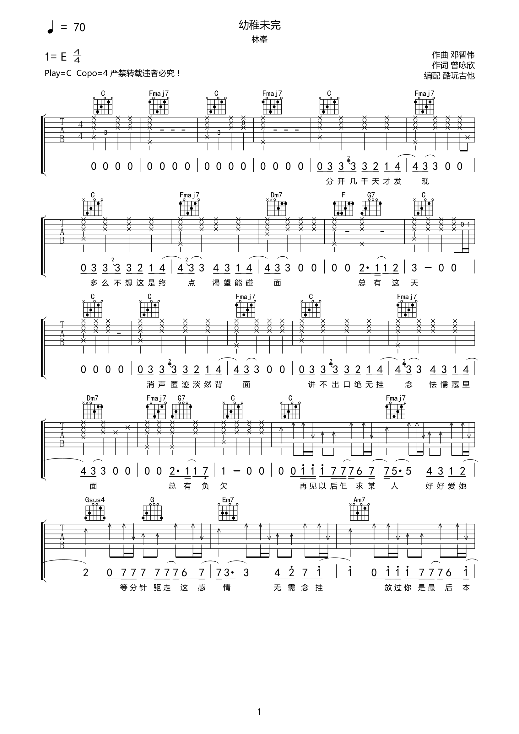 林峯《幼稚未完》吉他谱-C调弹唱谱完整高清原版现年42岁的林峯于去年宣布回归香港乐坛,并推出了由林家谦作曲的《唱情歌的人》后,2月14日发布新歌《幼稚未完》。这次林峯再度与邓智伟合作,而新歌是2012年大热歌曲,无线剧《雷霆扫毒》的片尾曲《幼稚完》的二部曲续集,勾起大家的集体回忆!