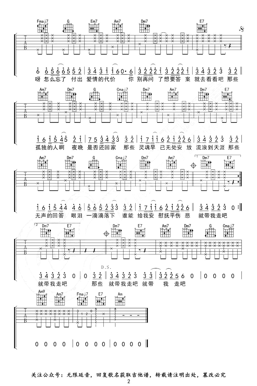 孤独颂歌吉他谱_陈文非_C调_弹唱六线谱原调E,变调夹4品,选用C调指法,两张图片六线谱。