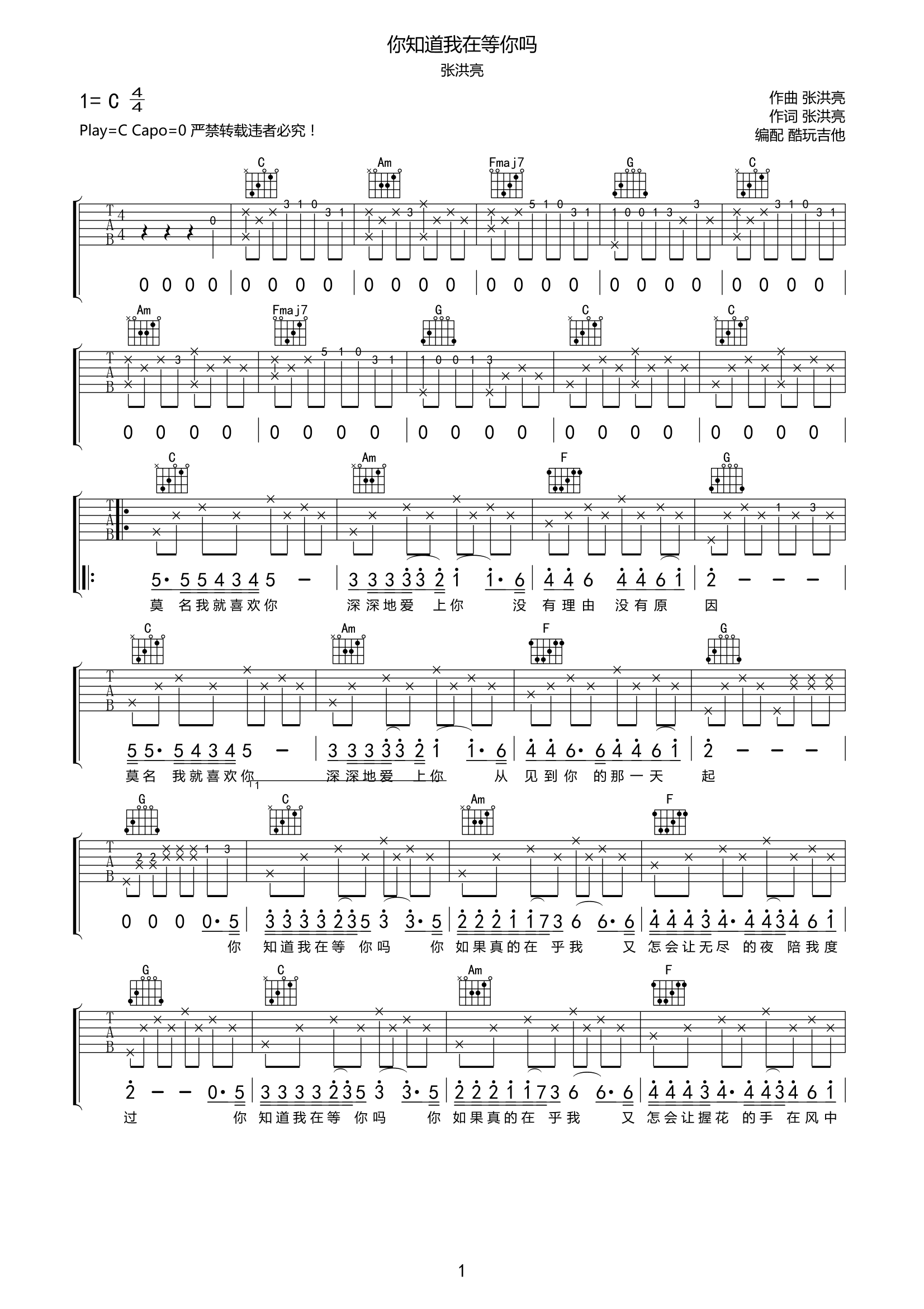 张洪亮《你知道我在等你吗》吉他谱-C调附间奏