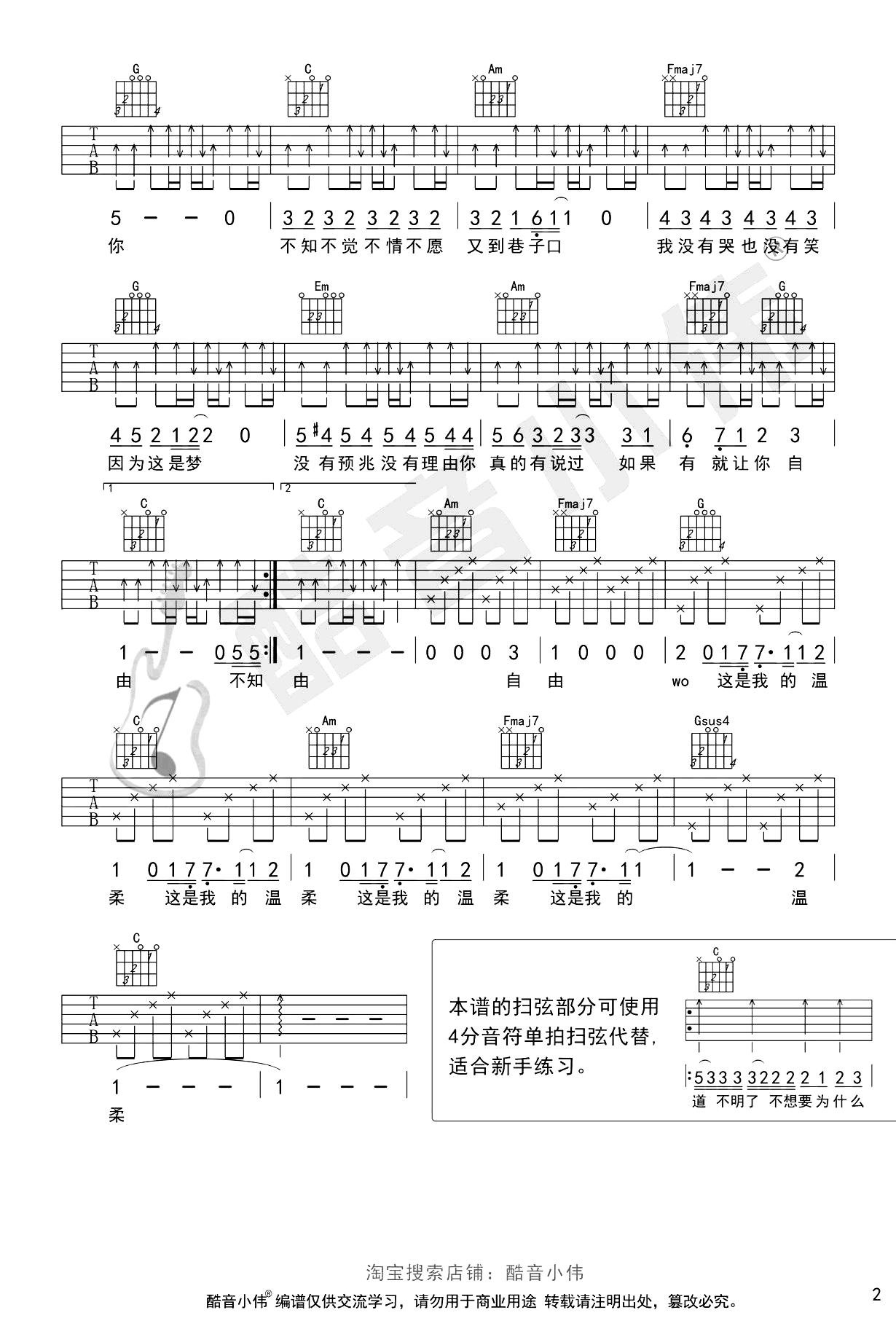 温柔吉他谱,五月天演唱,扫弦伴奏版,难度提升,适合琴友们练习扫弦。《温柔》吉他弹唱谱,原调为G调,选用C调指法编配,变调夹推荐男生2-5品女生7-9品,共两张图片六线谱,感谢酷音小伟编配。 这一首歌原本是摇滚的旋律,然而,在那深情的唱腔下,它却变得更像一首情歌。阿信真挚的情感和那令人潸然泪下的旋律,仿佛为爱的祝福注入了无限的情感。本谱的扫弦部分,可以使用四分音符单拍扫弦代替,适合新手练习,具体参考图片谱标注。