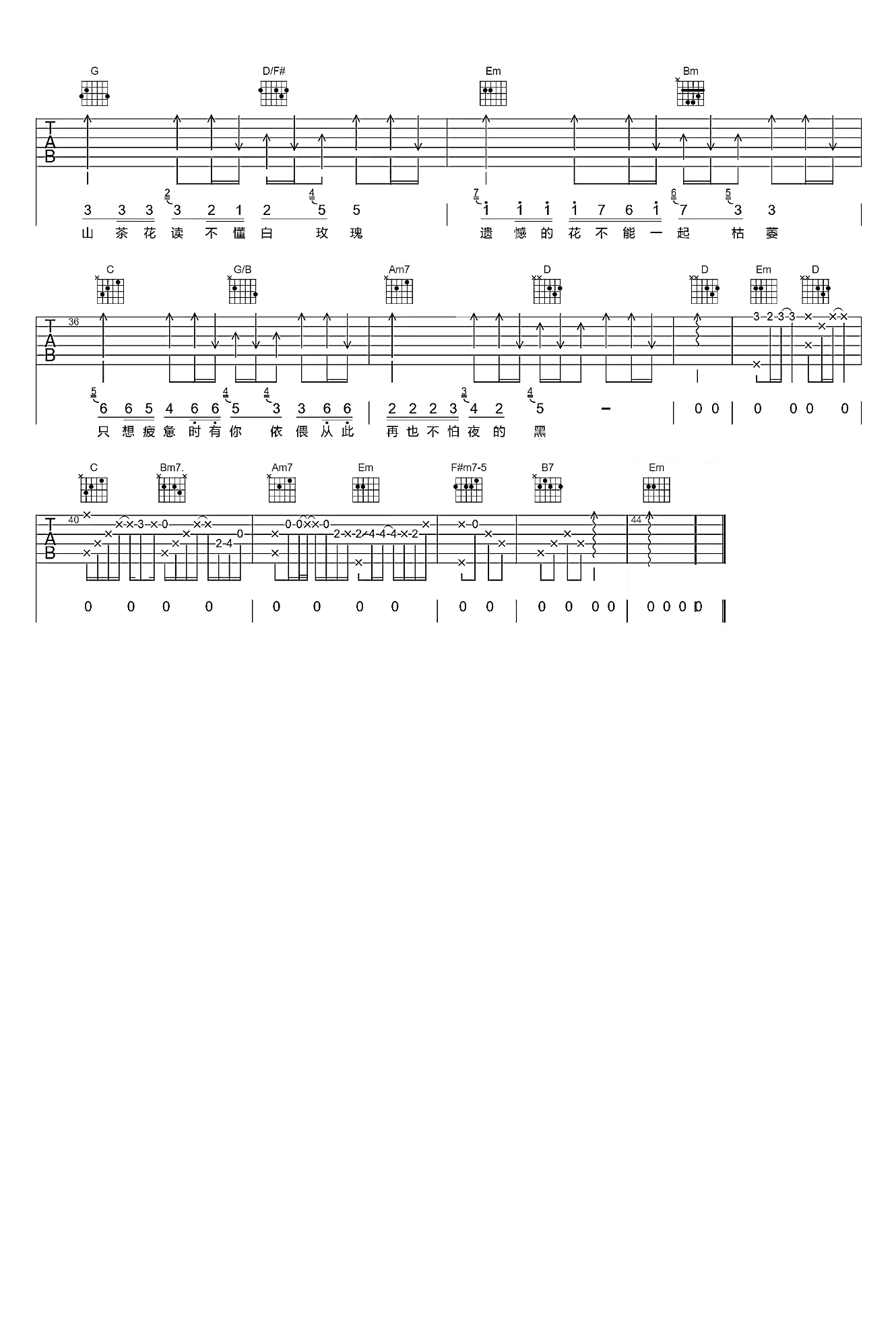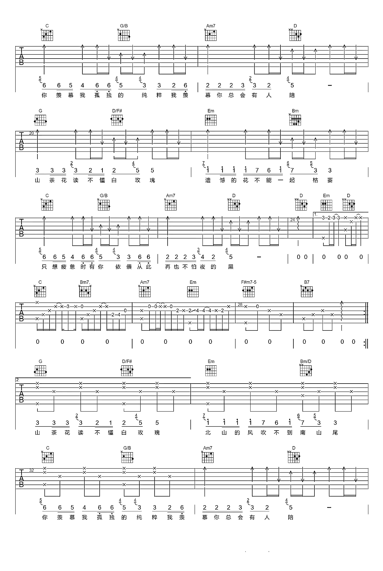 山茶花读不懂白玫瑰吉他谱,LIL笑笑一首网络热门歌曲,《山茶花读不懂白玫瑰》吉他弹唱谱,原调为B调,选用C调指法编配,变调夹Capo4品。完整版共三张高清图片谱,酷玩吉他更新。 山茶花,不懂白玫瑰的心情, 北山的风吹不到南山的尾。 你羡慕我孤独的纯粹, 而我羡慕你有人相陪。 山茶花,无法理解白玫瑰, 遗憾这两朵花无法一同枯萎。 只期望在疲惫时有你相依, 从此不再畏惧夜的黑。