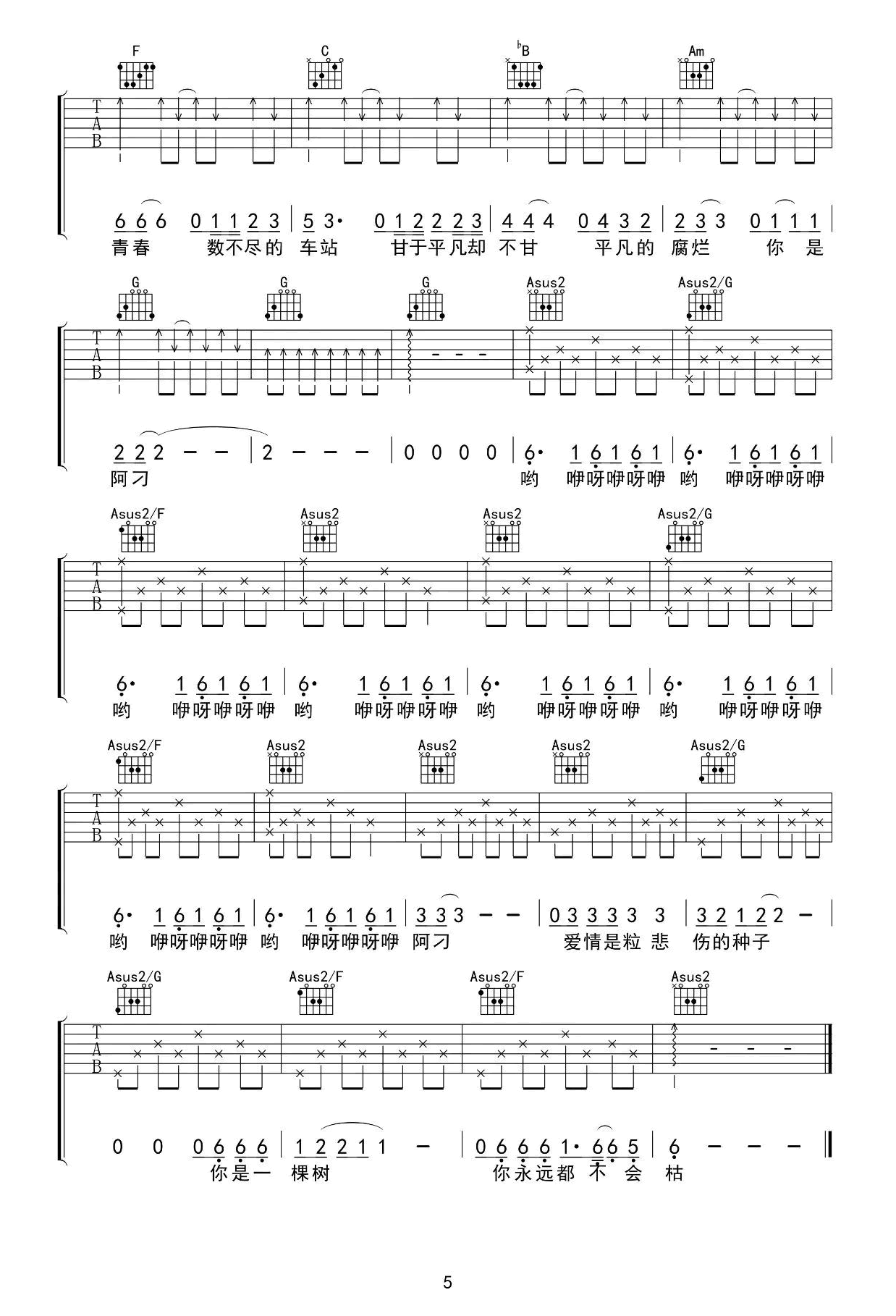 阿刁吉他谱,赵雷一首经典民谣老歌,随谱附上吉他弹唱演示视频。《阿刁》吉他弹唱谱,原调F,选用C调指法编配,变调夹夹五品。完整版六线谱共5张图片,感谢吉他专家分享,酷玩吉他更新上传。 歌曲高潮里面用的降B和弦很有味道哦,这个和弦的组成音是:降si re fa ,所以替换性很强,可以替代二级、四级、五级和弦,一首歌曲里面偶尔有几个色彩和弦是很有味道的,大家平时在弹琴配和弦的时候可以大胆运用。