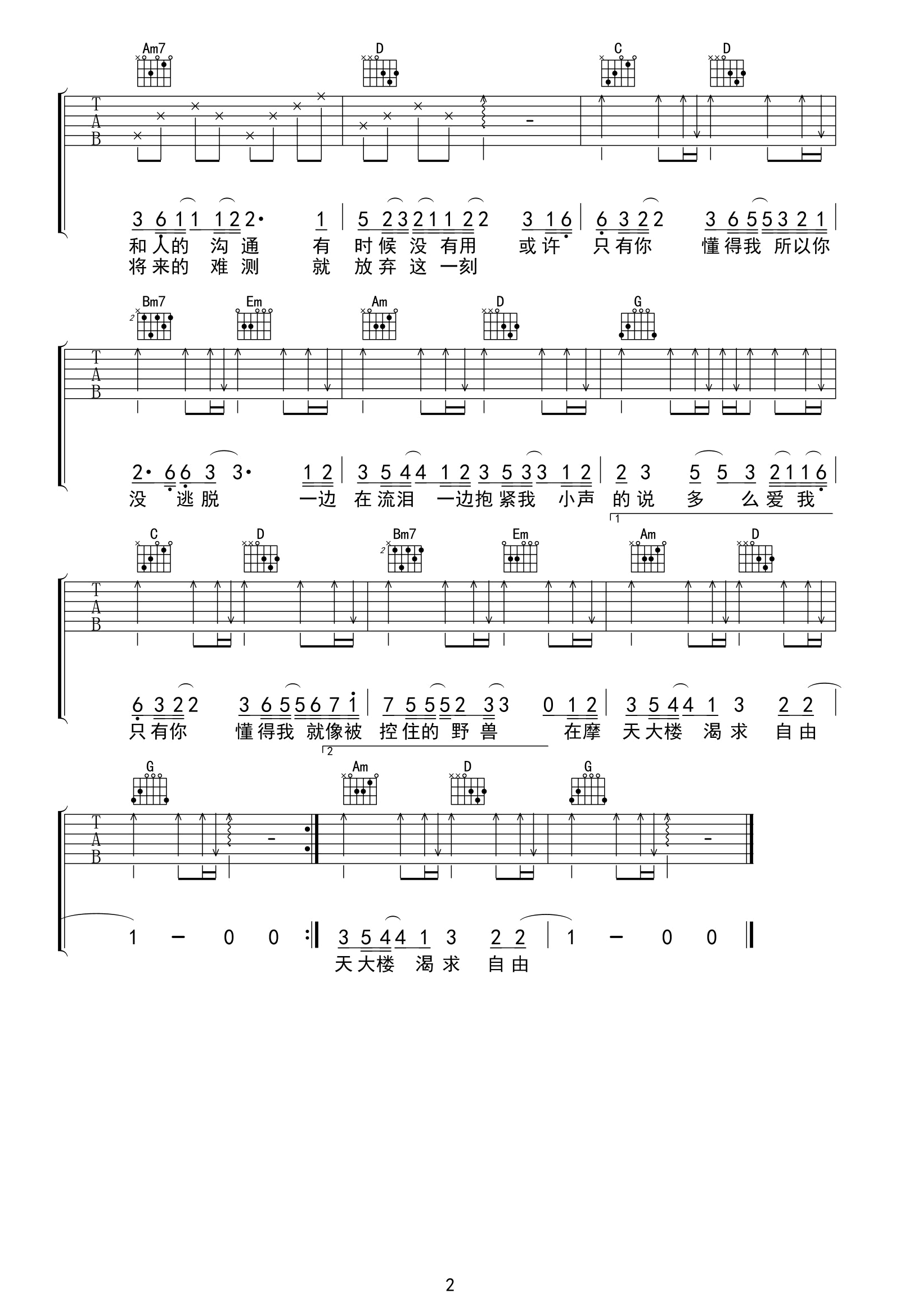 想自由吉他谱,林宥嘉一首经典歌曲,为我们提供了释放情绪的空间,让我们重新寻找新的力量和希望。《想自由》吉他弹唱谱,原调A,选用G调指法编配,完整版共两张六线谱,感谢圆创吉他出品,酷玩吉他更新。 人生中难免会遇到挫折与困境,让我们感到心情低落,束手无策。此时,一首歌曲就像是一个出口,《想自由》唤醒了我们内心深处的渴望。