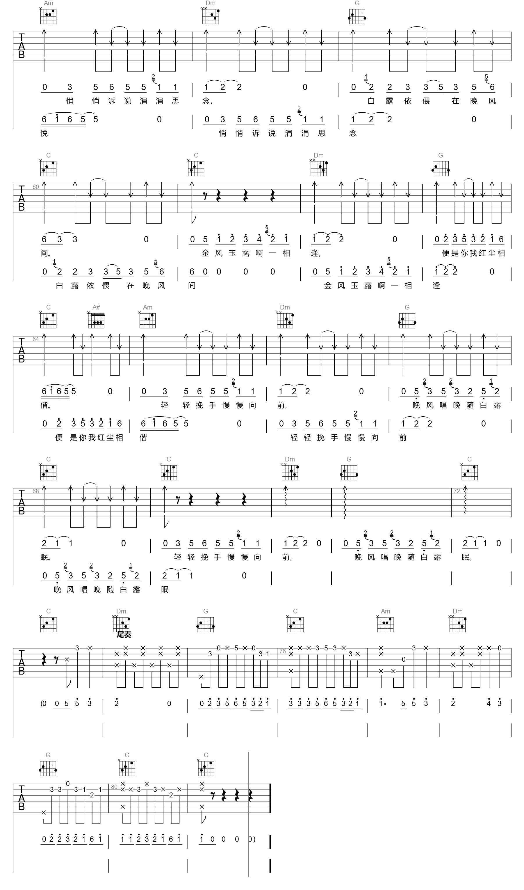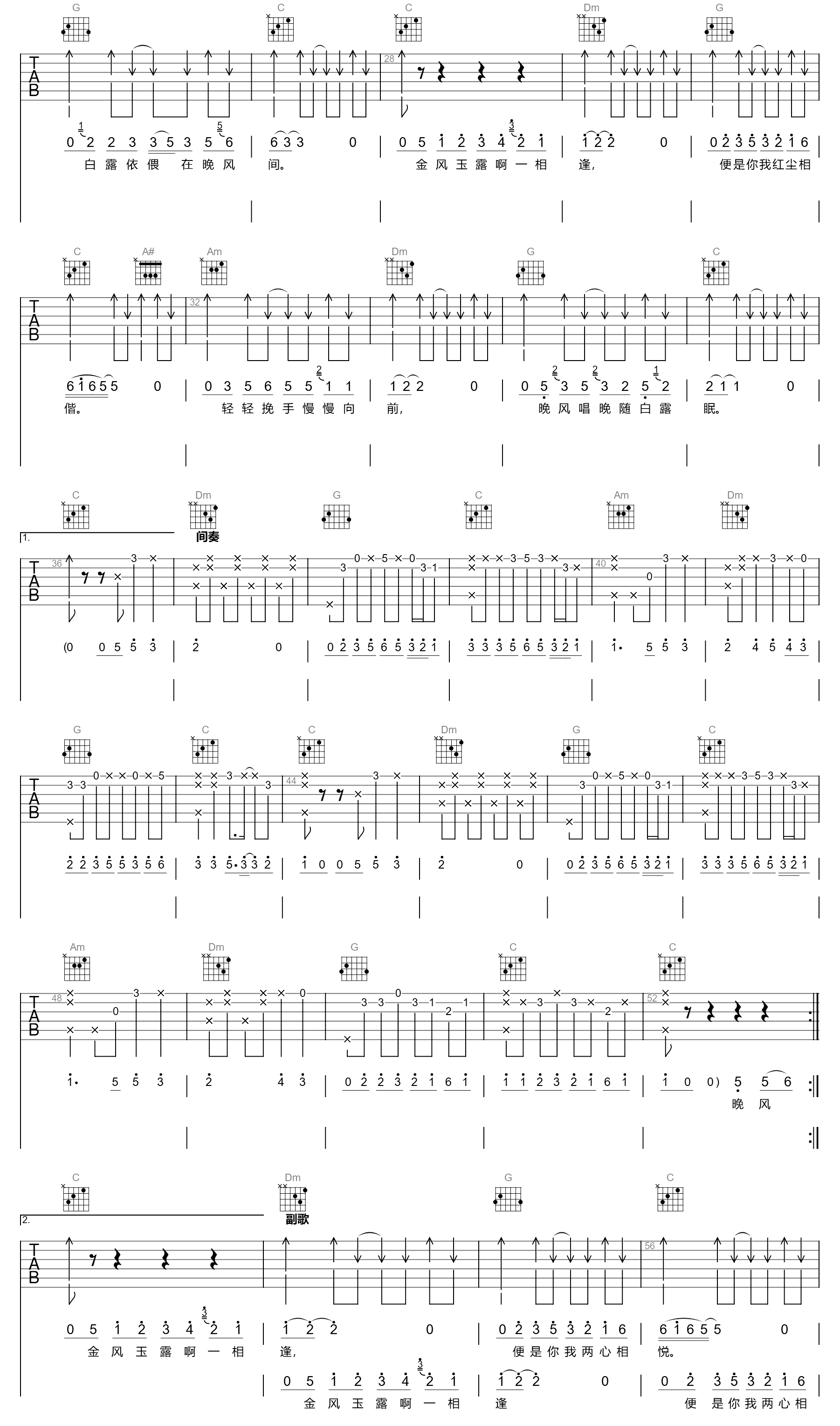 金风玉露吉他谱,旅行新蜜蜂演唱,金风玉露啊一相逢,便是你我两心相悦。瞬间带入那个热烈且浪漫的黄金年代。《金风玉露》吉他弹唱谱,选用C调指法编配,变调夹3品转4品,(主歌分解伴奏转副歌扫弦节奏时调整),六线谱完整编配共三张高清图片,感谢革命吉他出品,酷玩吉他上传更新。 晚风轻拂,撩动着情人心上的琴弦,奏起一曲,把你带到我的身旁。白露渐浓,浸润着情人温柔的面庞,唤醒我,让我倾诉内心的情话。
