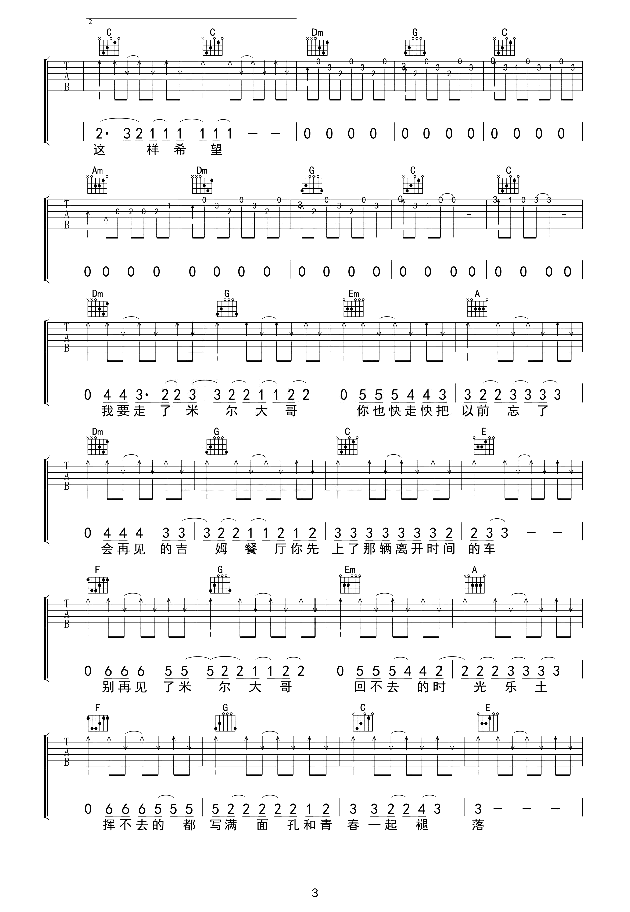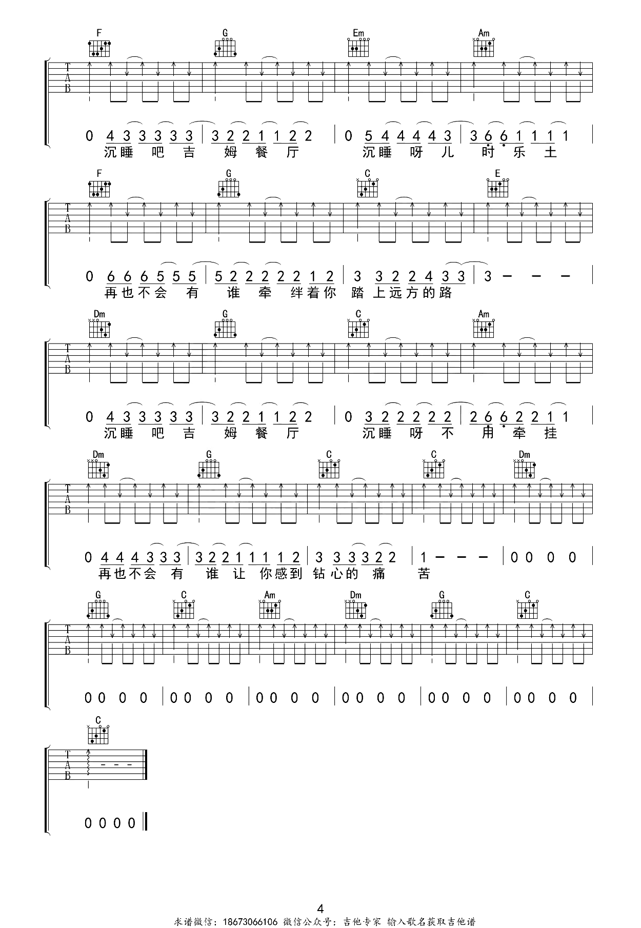 吉姆餐厅吉他谱,赵雷词曲创作演唱,一首经典的民谣歌曲,总有一个地方,在等你回来。《吉姆餐厅》吉他六线谱,原调降E,选用C调指法编配,变调夹Capo3品,完整版共四张图片谱,感谢吉他专家出品分享,酷玩吉他上传。 每个心中都藏有一间名为“吉姆餐厅”的地方,每个心中都有一个家园。每天,人们聚集在这里共进美食,然而是否像我一样,怀念着过去,怀念着那些曾与我们同行的故人?未来的命运如何,我亦不得而知,但就像母亲曾告诉我的,永远向前走下去。