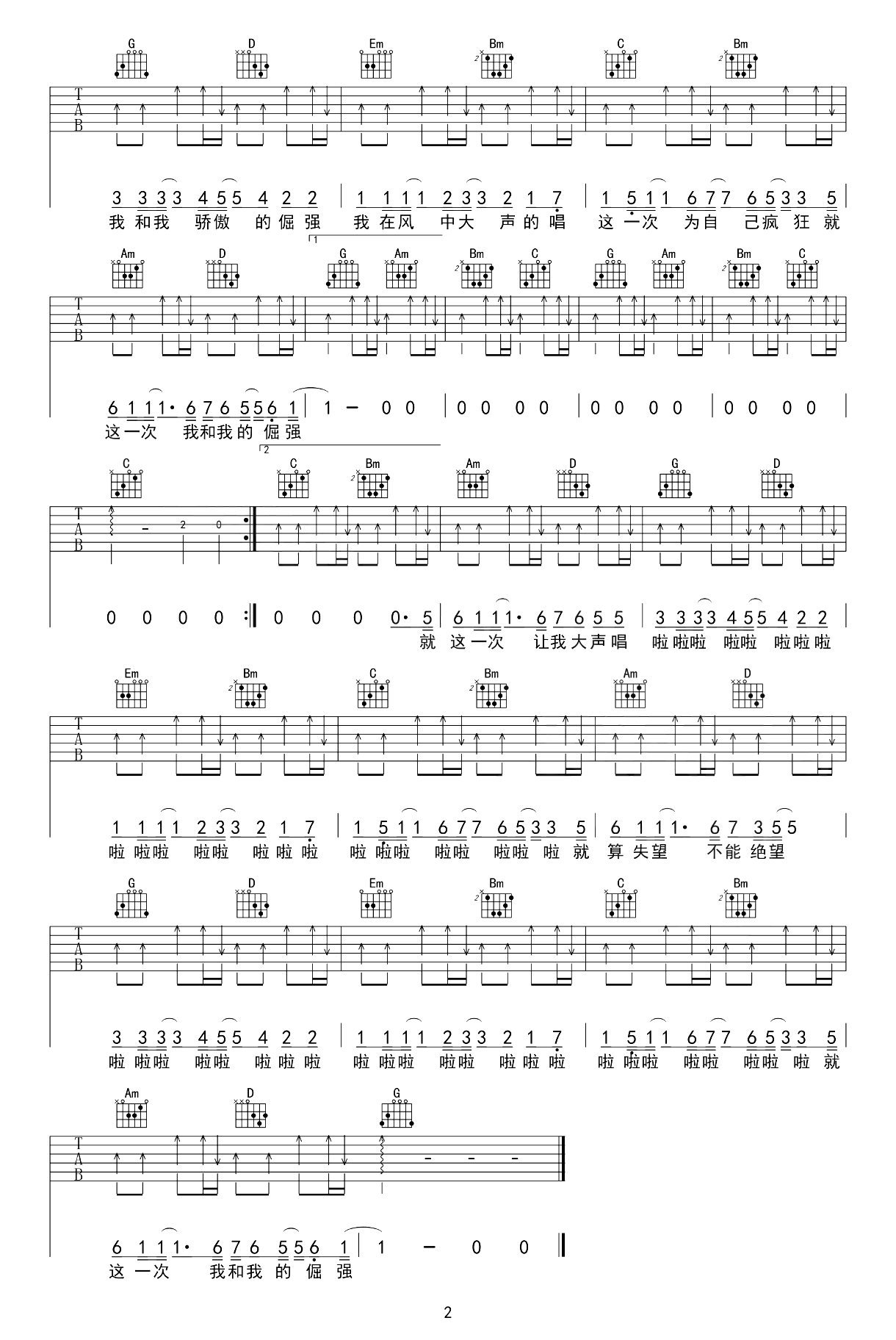 倔强吉他谱,五月天一首经典热血歌曲,我们每个人都在与规则对抗,同时也在与自己进行较量。《倔强》吉他弹唱谱,原调A,选用G调指法编配,变调夹capo2品,共两张图片六线谱,感谢革命吉他编配出品,酷玩吉他更新。 犹如一位燃烧着梦想的少年,明知事与愿违,却依然努力奋斗。少年的梦想绝不允许任何人轻视。每个人都是从倔强的追梦少年阶段走过来的,当你失去了热情时,就让这首歌曲点燃你内心的热血吧。