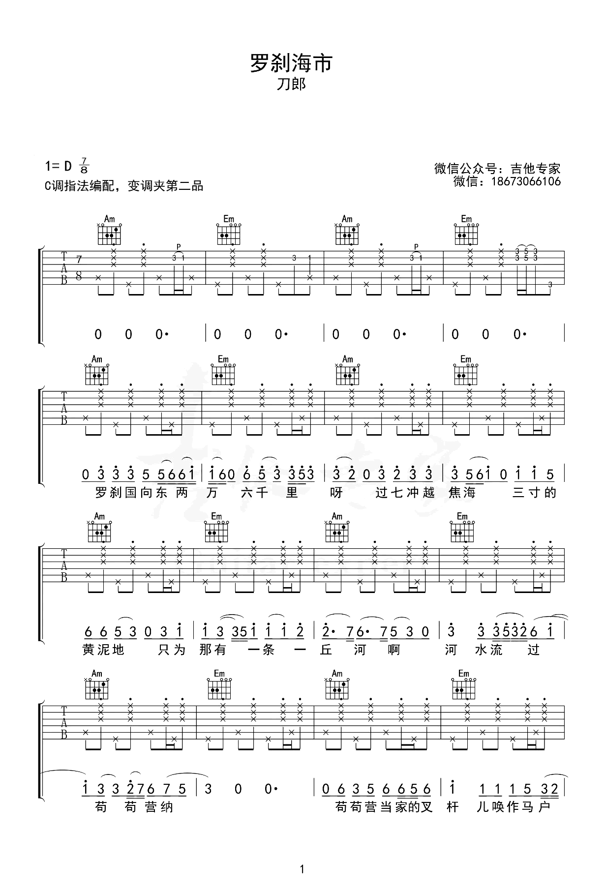 罗刹海市吉他谱,刀郎演唱,这首歌曲的歌词充满着隐晦,拥有着多种不同的解读方式,堪称2023年最燃神曲。《罗刹海市》吉他弹唱谱,原调D,采用C调指法编配,变调夹capo2品,完整版共四张图片六线谱,曲谱来自于吉他专家编配分享,酷玩吉他上传更新。 每个人心中都有属于自己的罗刹海市。刀郎运用了东方音乐元素的色彩,创造出离奇玄幻的故事情节,神秘而隐晦的歌词,将现实与超现实的幻想完美融合,也探索人性与命运的关系。