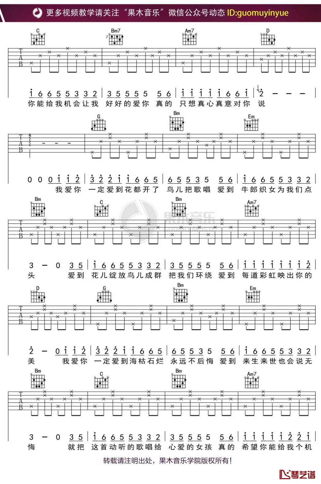 - 田一龙《一定要爱你》吉他谱-C调弹唱谱高清