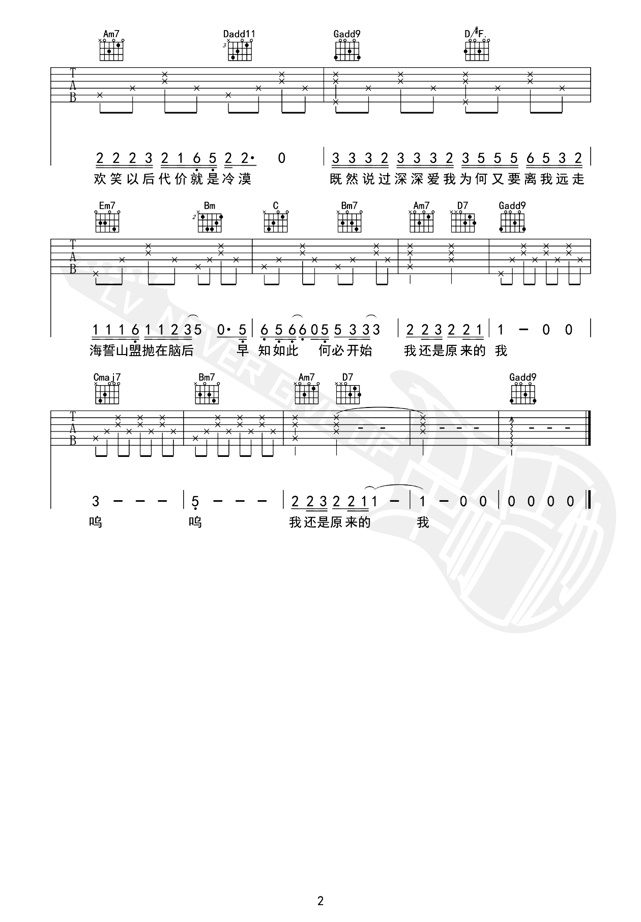 原来的我吉他谱,陈楚生《披荆斩棘》live现场版本,翻唱齐秦的经典老歌让人惊艳,歌声想起,又见16年前那个清澈的少年。《原来的我》吉他弹唱谱,原调bB,选用G调指法,六线谱共两张图片谱例,感谢革命吉他出品,酷玩吉他更新上传。 陈楚生的歌声穿越了时间的沧桑,依然保持着清澈动人的特质。它仿佛饱含了岁月的风霜,却又展现出一种不被岁月侵蚀的永恒魅力。歌声始终散发着独特的韵律,为无数人带来感动和温暖。随谱附上《原来的我》吉他弹唱教学视频,琴友们跟随老师的示范讲解学习起来吧。
