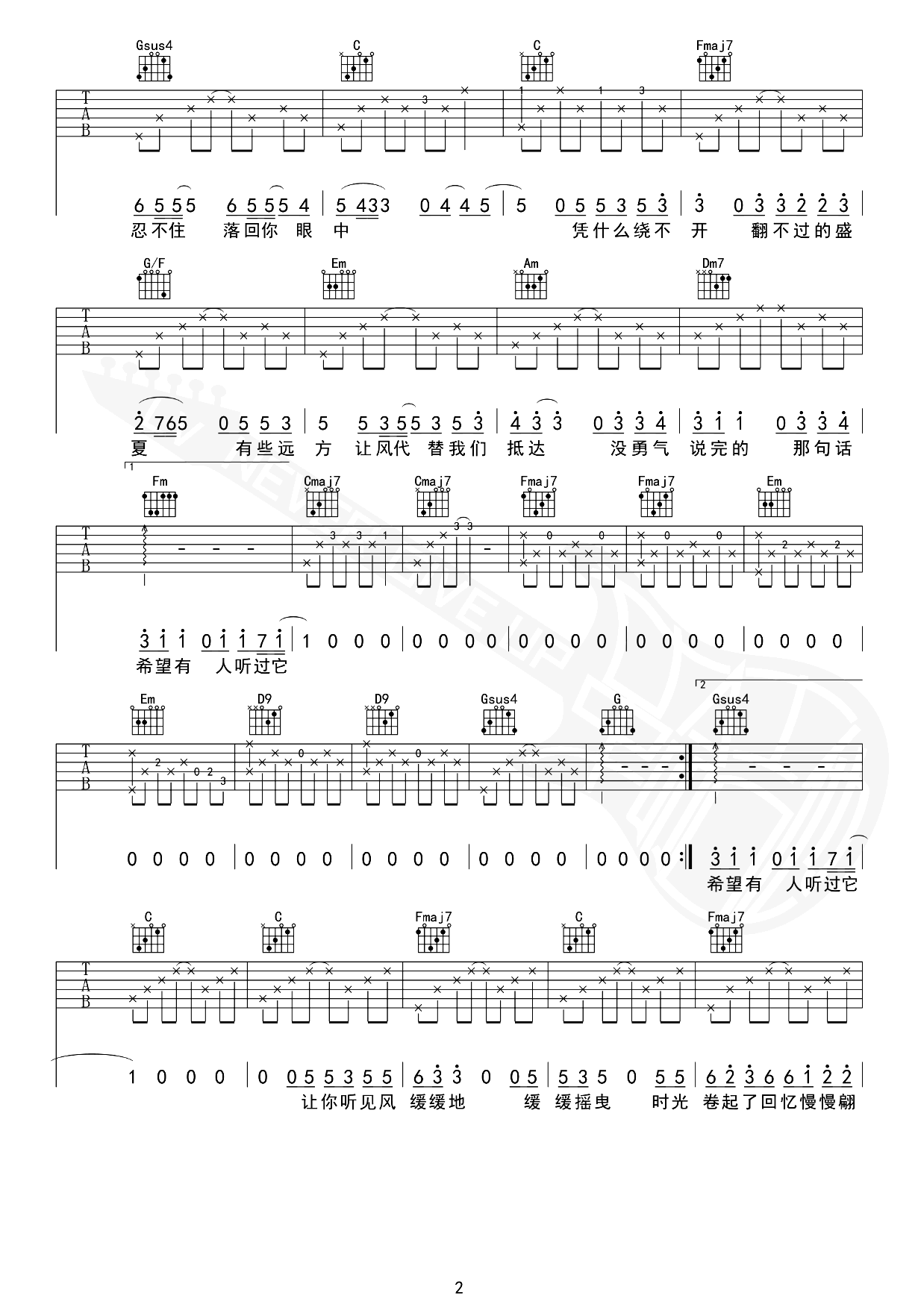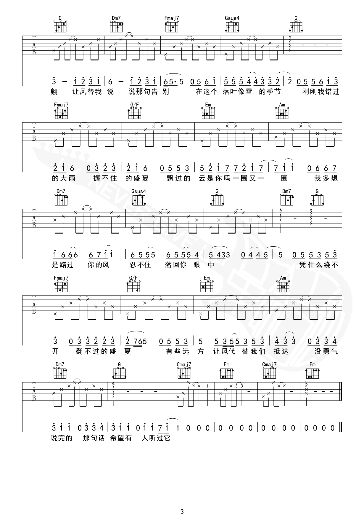 想你时风起吉他谱,单依纯演唱,电影《我的人间烟火》回忆主题曲 。歌声述说着一份不经意中勾起久久不能平复的心绪。《想你时风起》吉他六线谱,原调升F,选用C调指法,建议变调夹Capo6品,完整编配版共三张图片六线谱,感谢革命吉他上传,酷玩吉他上传更新。 故事如诗随风流转,心事如风悠悠无法安宁,而内心的爱意,亦如夏日微风难以捕捉,曾经绚烂又充满忧伤,季节轮回无尽如梦幻,飘过的云彷徨盘旋不定,希望命运将我们再度相遇。