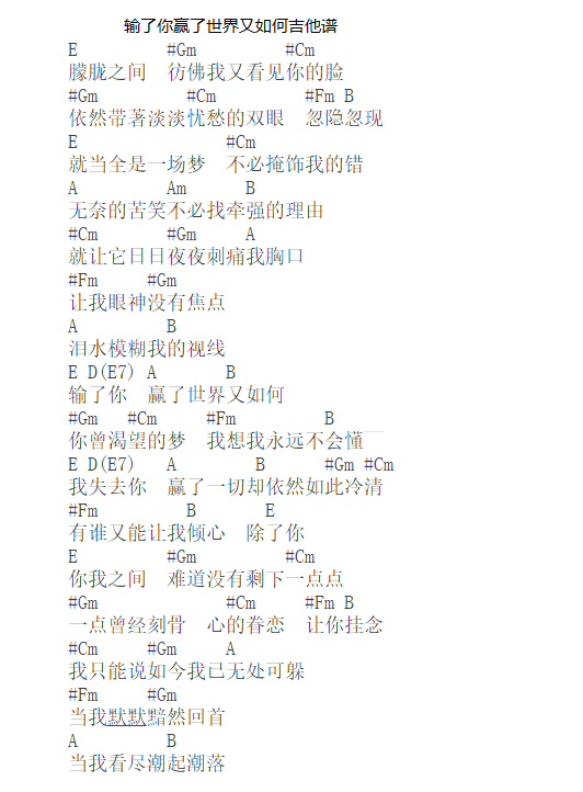 输了你赢了世界又如何吉他谱,编配,词曲詹兆源,原唱林志炫,黄丽玲(A-Lin)在《我是歌手》第三季的舞台,重新演绎了这首歌曲,字字唱入骨髓,醇厚磁性的歌声令听众过耳不忘,给人沧桑过后的一种成熟美感。输了你,赢了世界又如何?