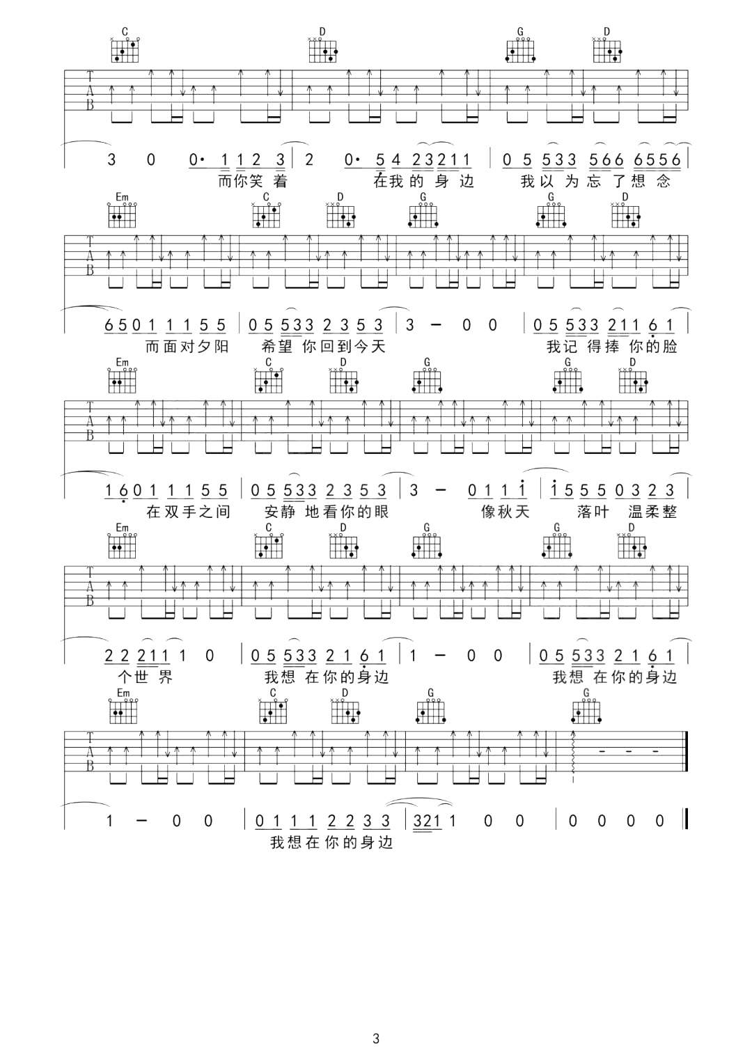盛哲《在你的身边》吉他谱,革命吉他编配出品,共有3张高清图谱。