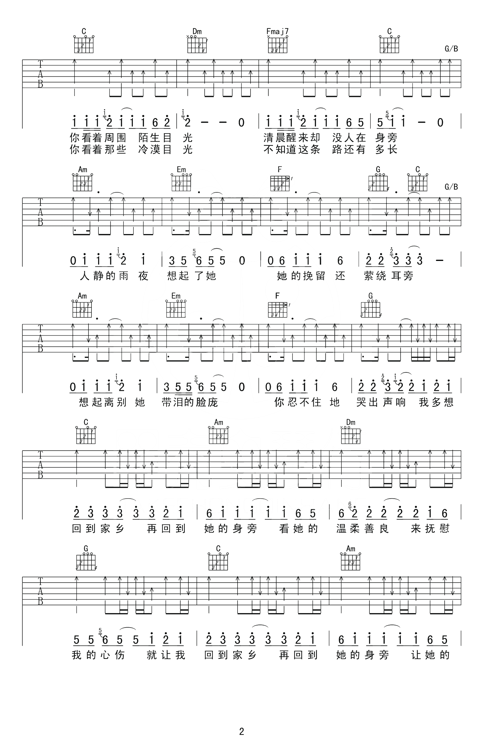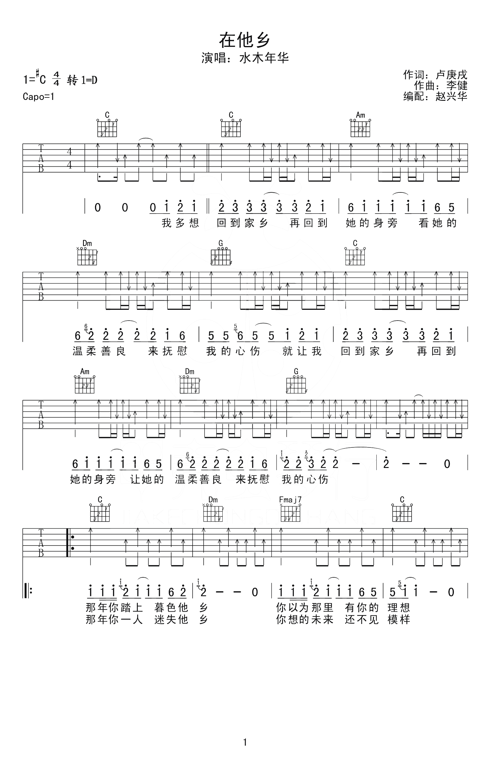 在他乡吉他谱,水木年华演唱,#C转D调,CAPO夹一品。一首歌曲《在他乡》唱出了很多异地求学打拼的人的心情。陌生的环境,思乡之情,对亲人,爱人的牵挂。在他乡一定有很多的艰辛和感触,而熟悉的旋律伴随着我们成长的时光。