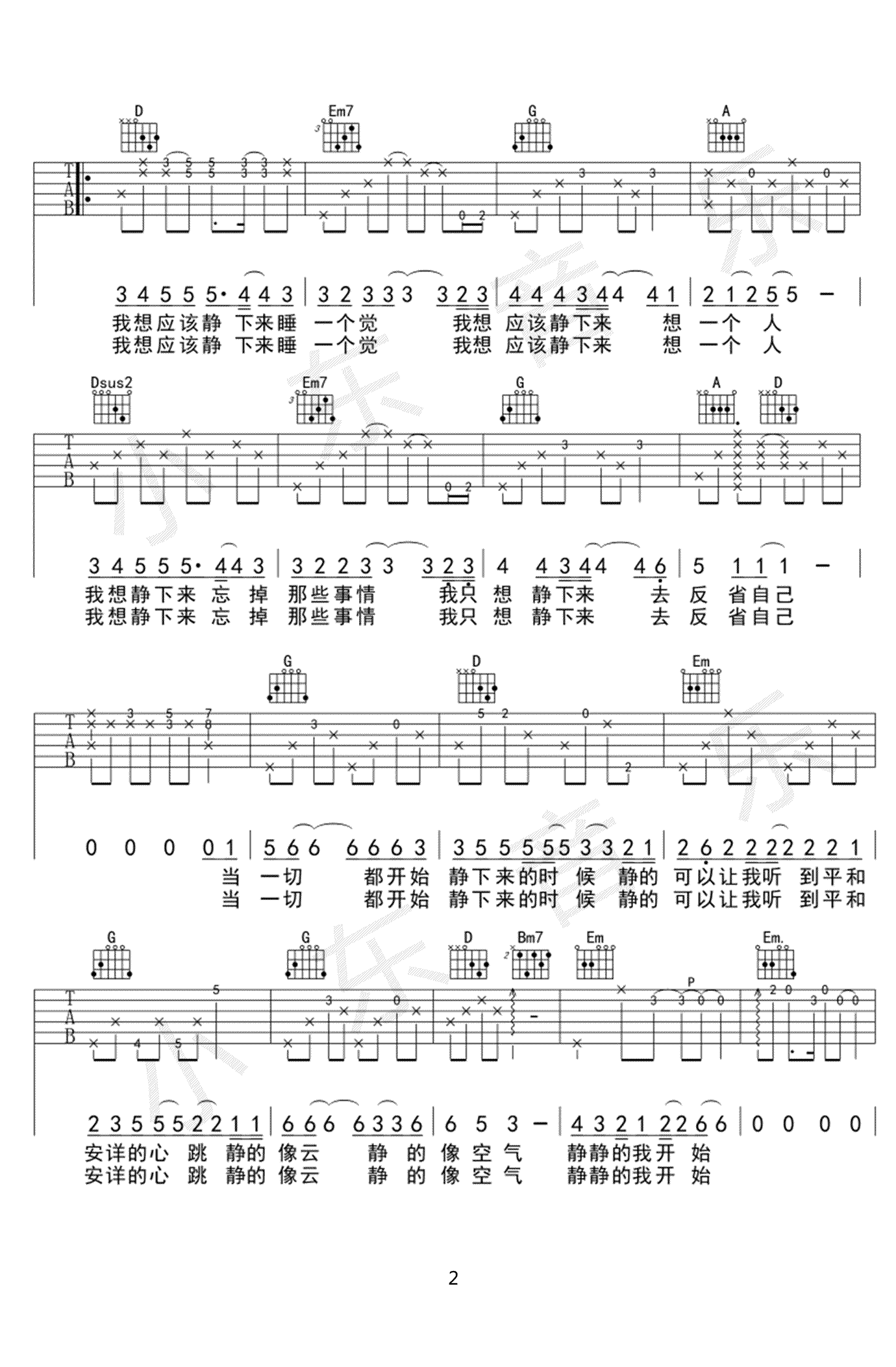 赵雷《静下来》吉他谱,原版D调编配,赵雷的一首词曲原创作品,多年前由大乔小乔演唱,如今老歌新编重新发布。俗世喧嚣难免浮躁,放下欲望安静思考,唯愿尘土消散,不忘来路,温暖而阳光的生活。