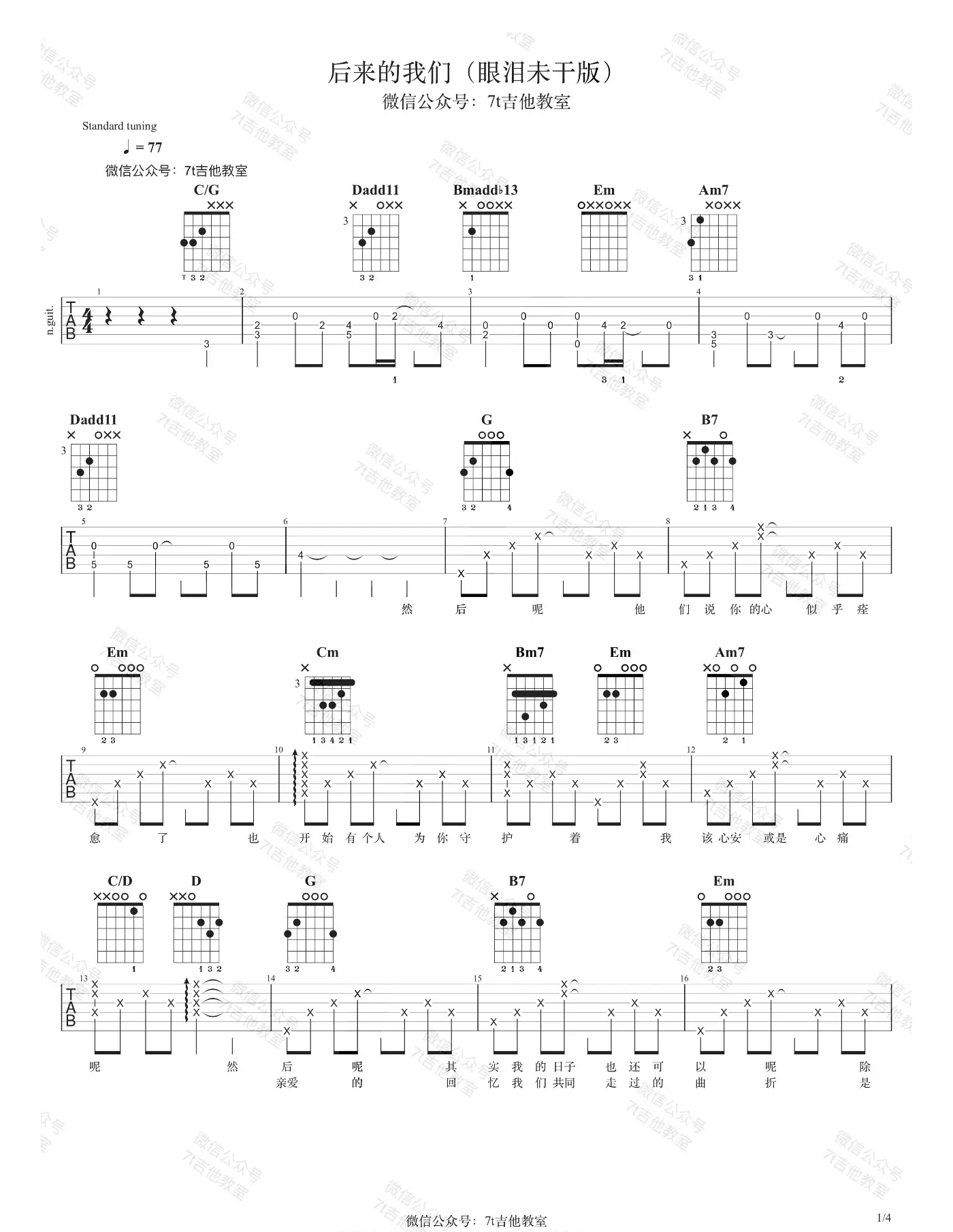 五月天《后来的我们》吉他谱,7T吉他教室编配出品,共有4张高清图谱。