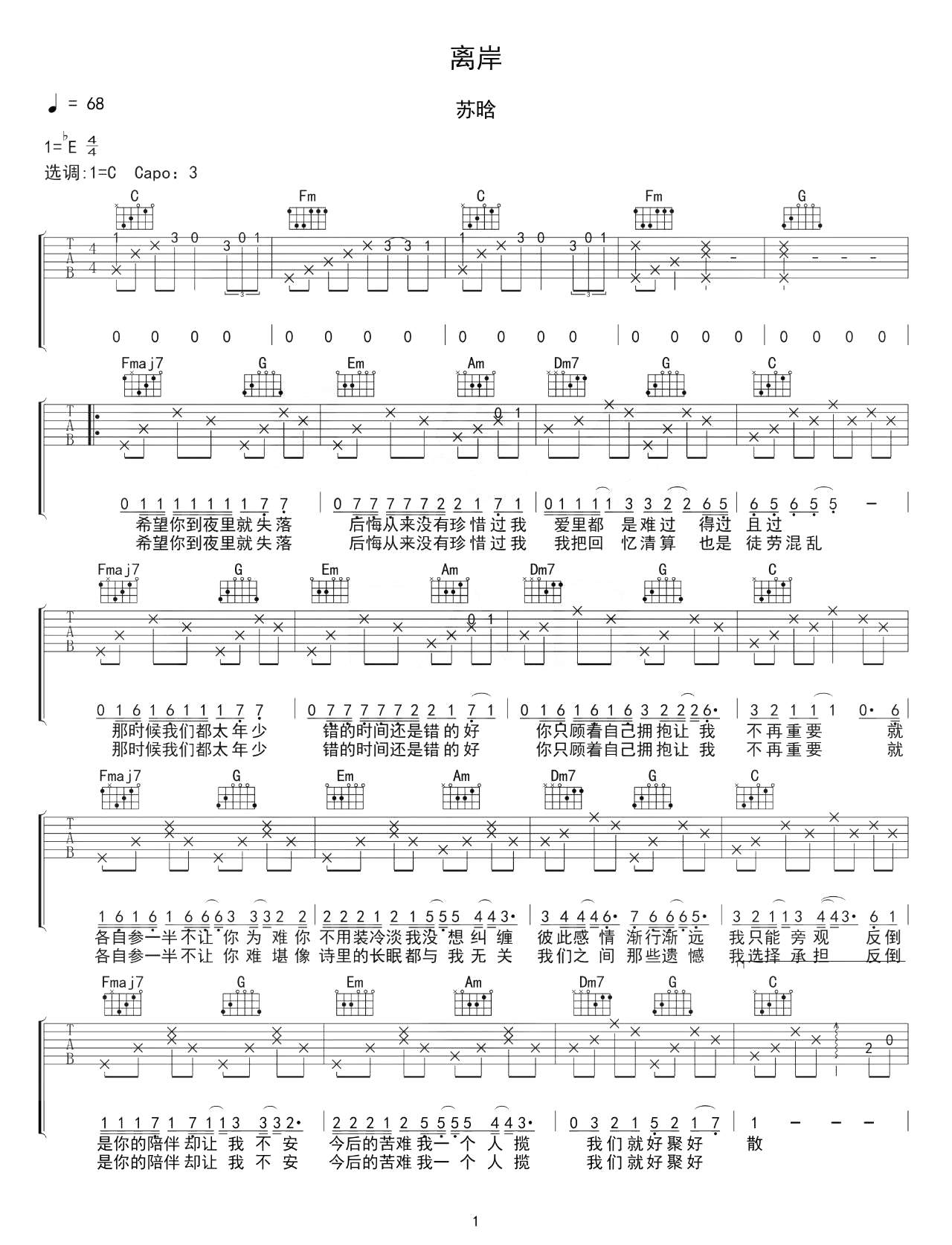 薛之谦《离岸》吉他谱_吉他弹唱谱_吴先生TAB编配