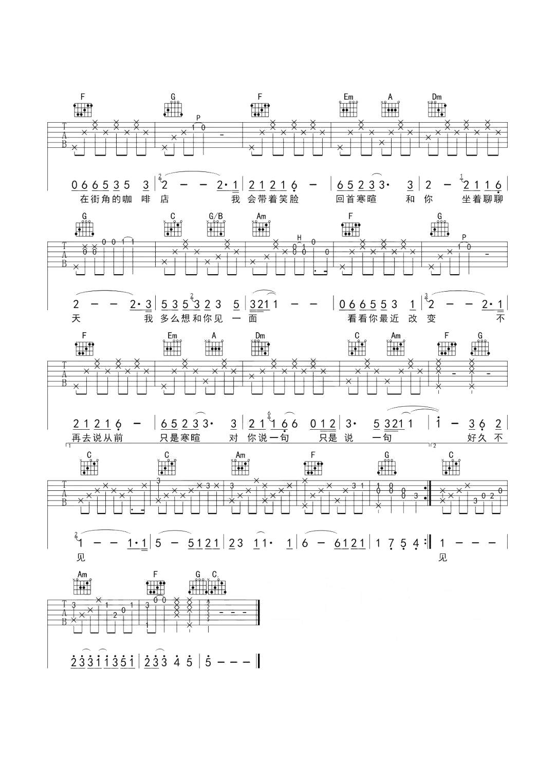 陈奕迅《好久不见》吉他谱,孙学长吉他教室编配出品,共有2张高清图谱,免翻页排版设计。