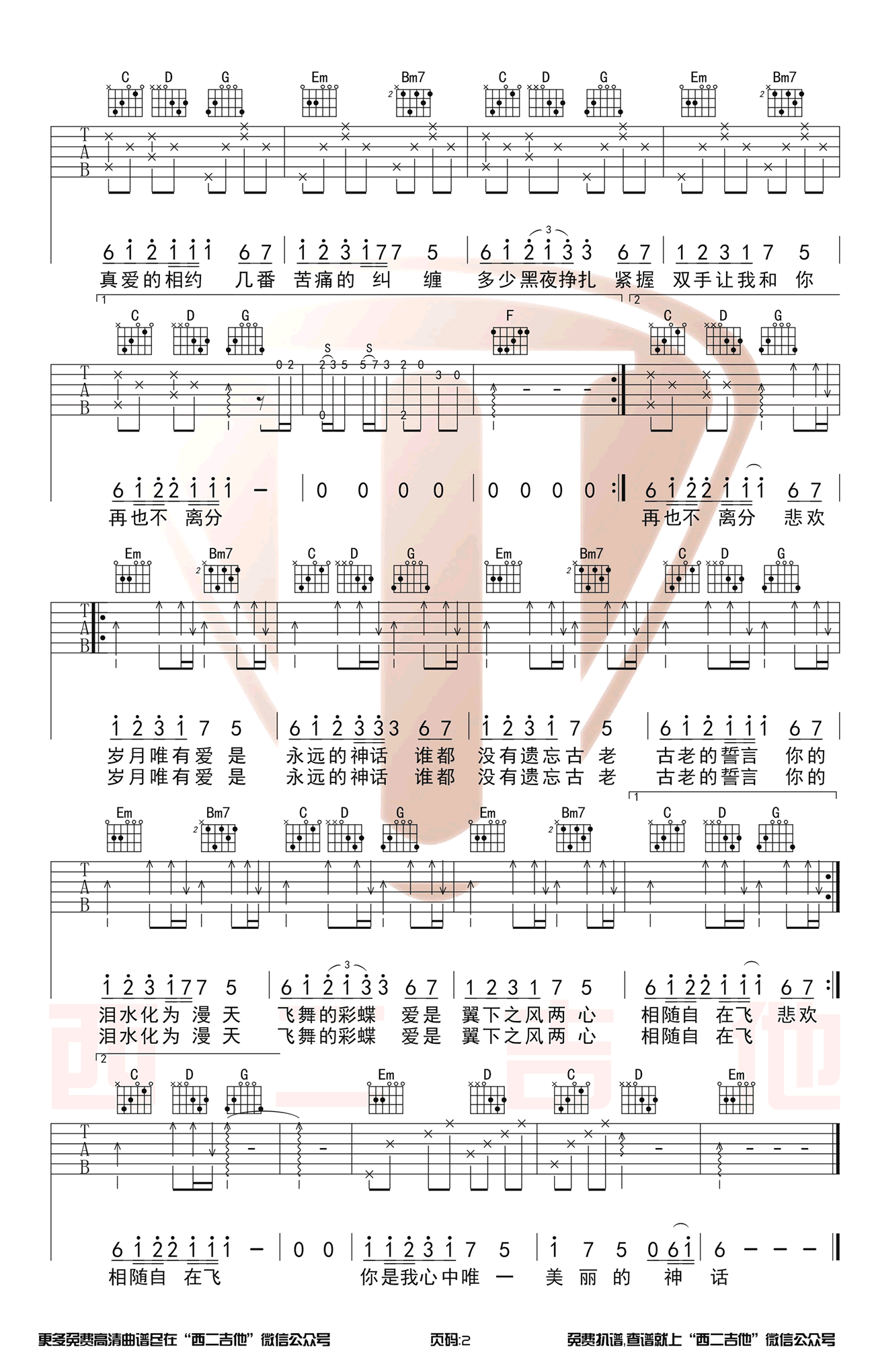 韩红/孙楠《神话》吉他谱,西二吉他编配出品,共有2张高清图谱,免翻页排版设计。