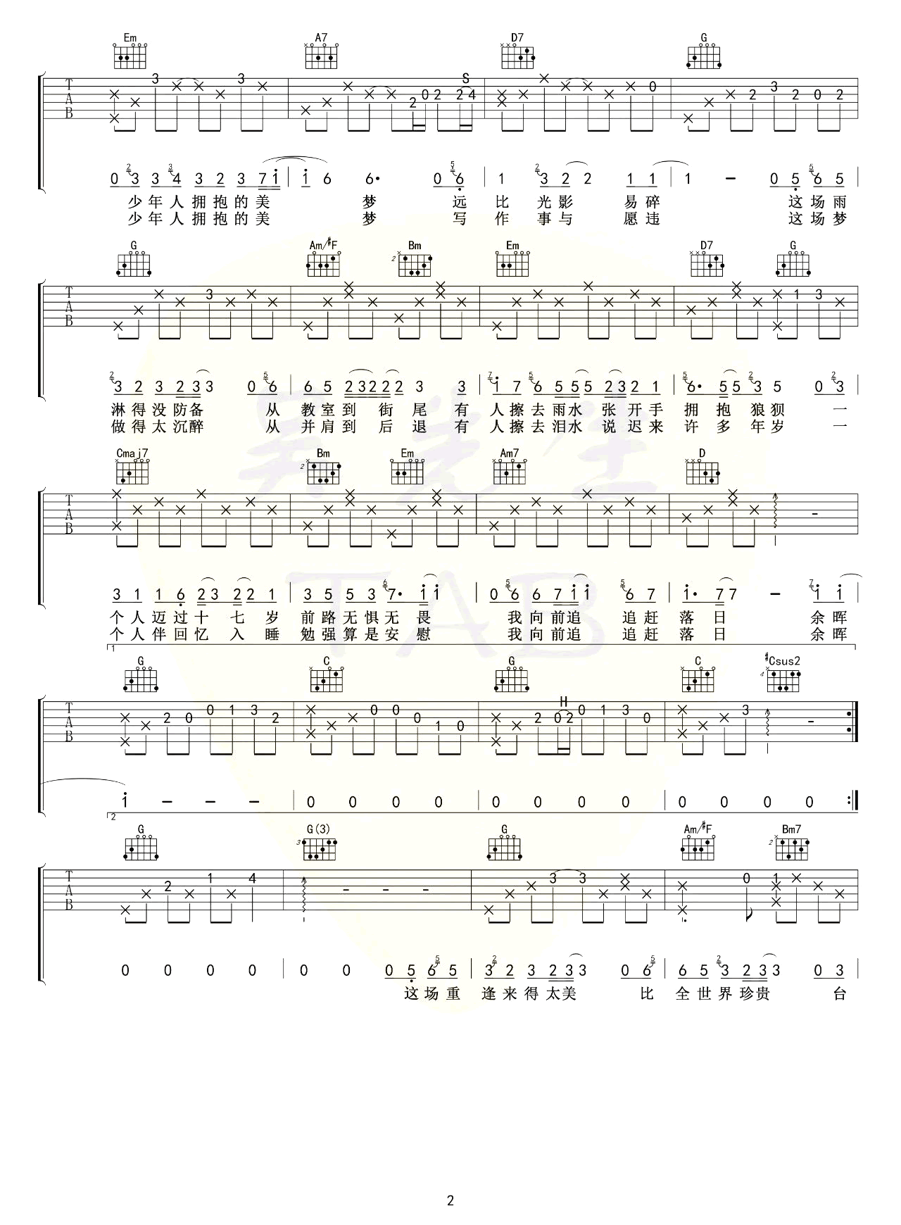 原调F选调G,降半音调弦,少年的生活多么纯粹,很多青涩的美好定格在时光的背后。写在一起的两个名字被衬的很相配,试着学电影里的画面扮天生一对,可想要拥抱的梦,却远比光影易碎。画面渐渐模糊,现实却事与愿违。一个人的十七岁,哭的狼狈却也笑着坚强。曾经誓言的珍贵,比肩的同行。犹记得那年如海水的天空,记得窗台的玫瑰香味,记得拥抱的街走过的路,你名字的一笔一划,清晰的印刻在了脑海。一路努力的向前奔跑,穿过了光阴,却在迟来的许多年岁与你重逢。轻描淡写的略过,两两相念的纯粹,原来那些年,未曾忘记。经过时光的掌纹,你走的路要繁花似锦,人声鼎沸。