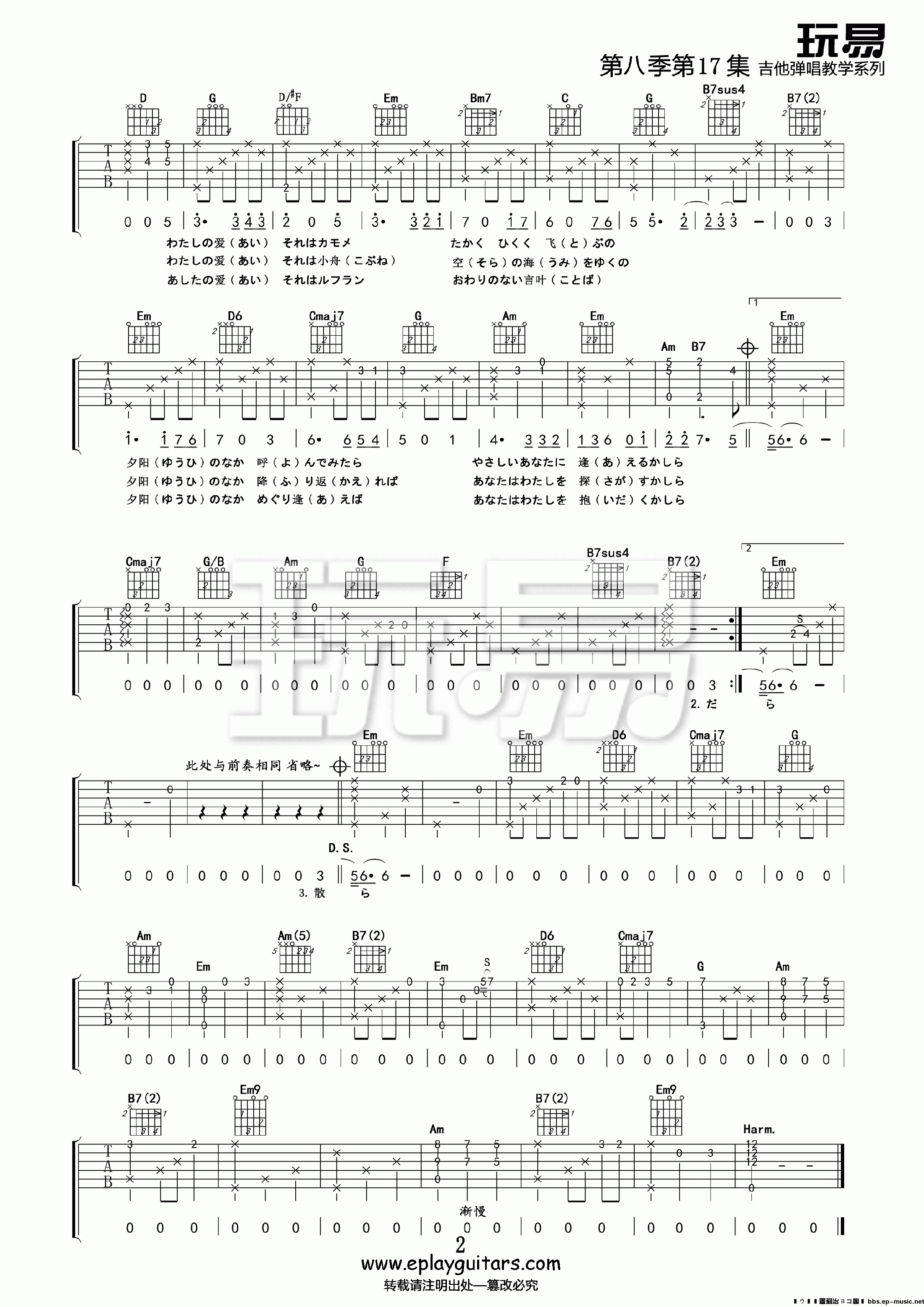 手嶌葵《别了夏天》吉他谱,玩易编配出品,共有2张高清图谱,免翻页排版设计。