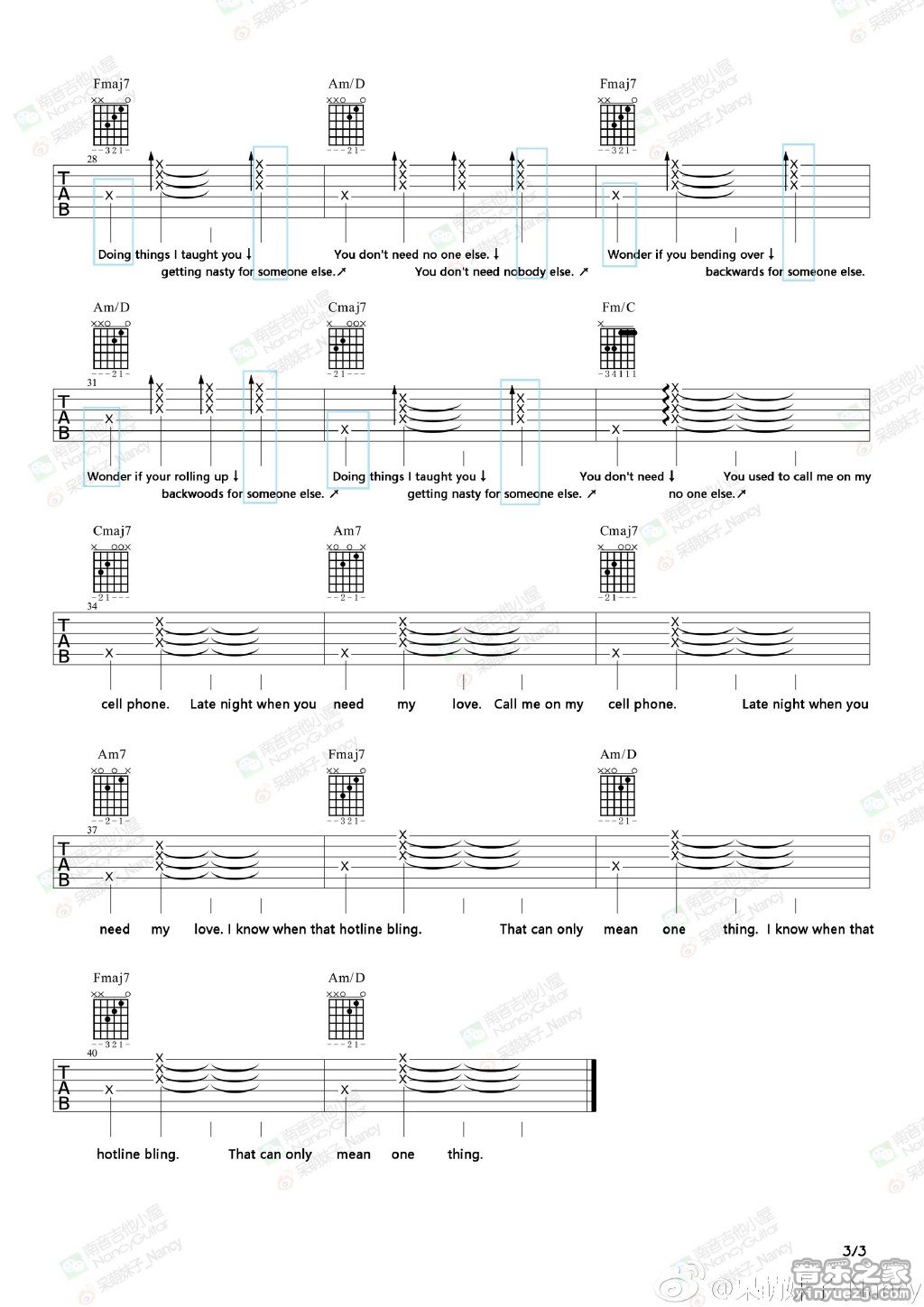 Drake《hotlinebling》吉他谱,南音吉他编配出品,共有3张高清图谱。