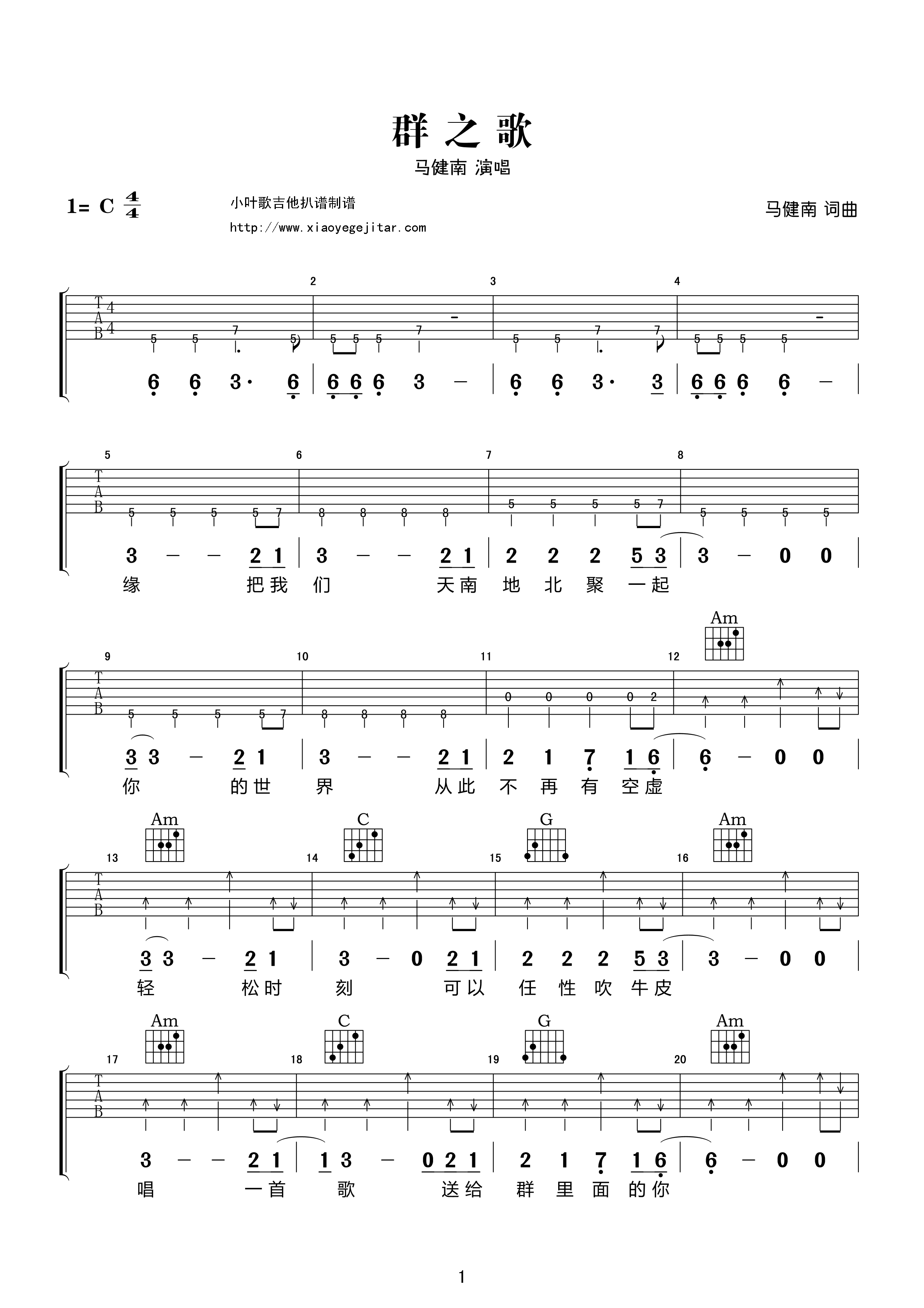 马健南《群之歌》吉他谱_吉他弹唱谱_小叶歌编配