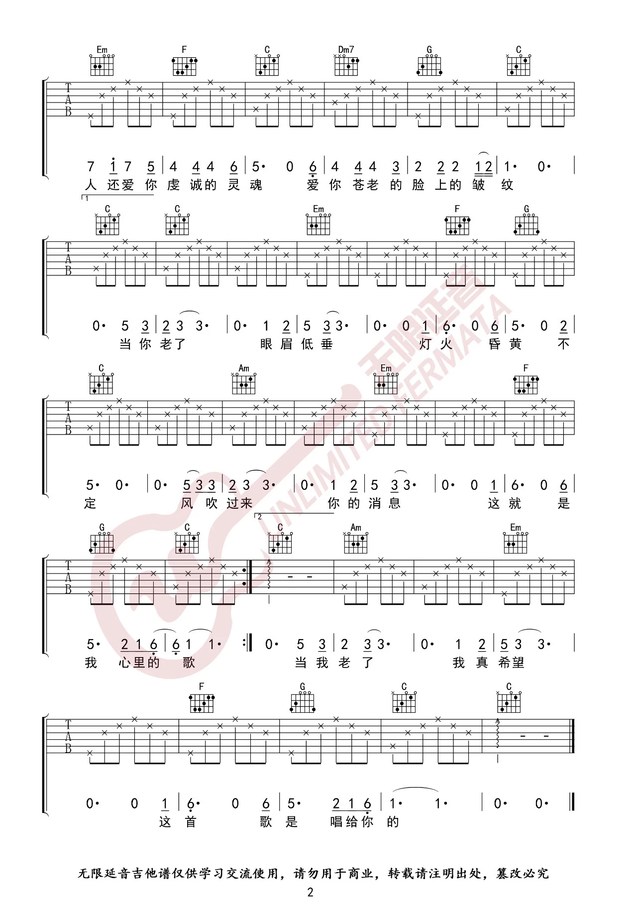 赵照《当你老了》吉他谱,无限延音编配出品,共有2张高清图谱,免翻页排版设计。