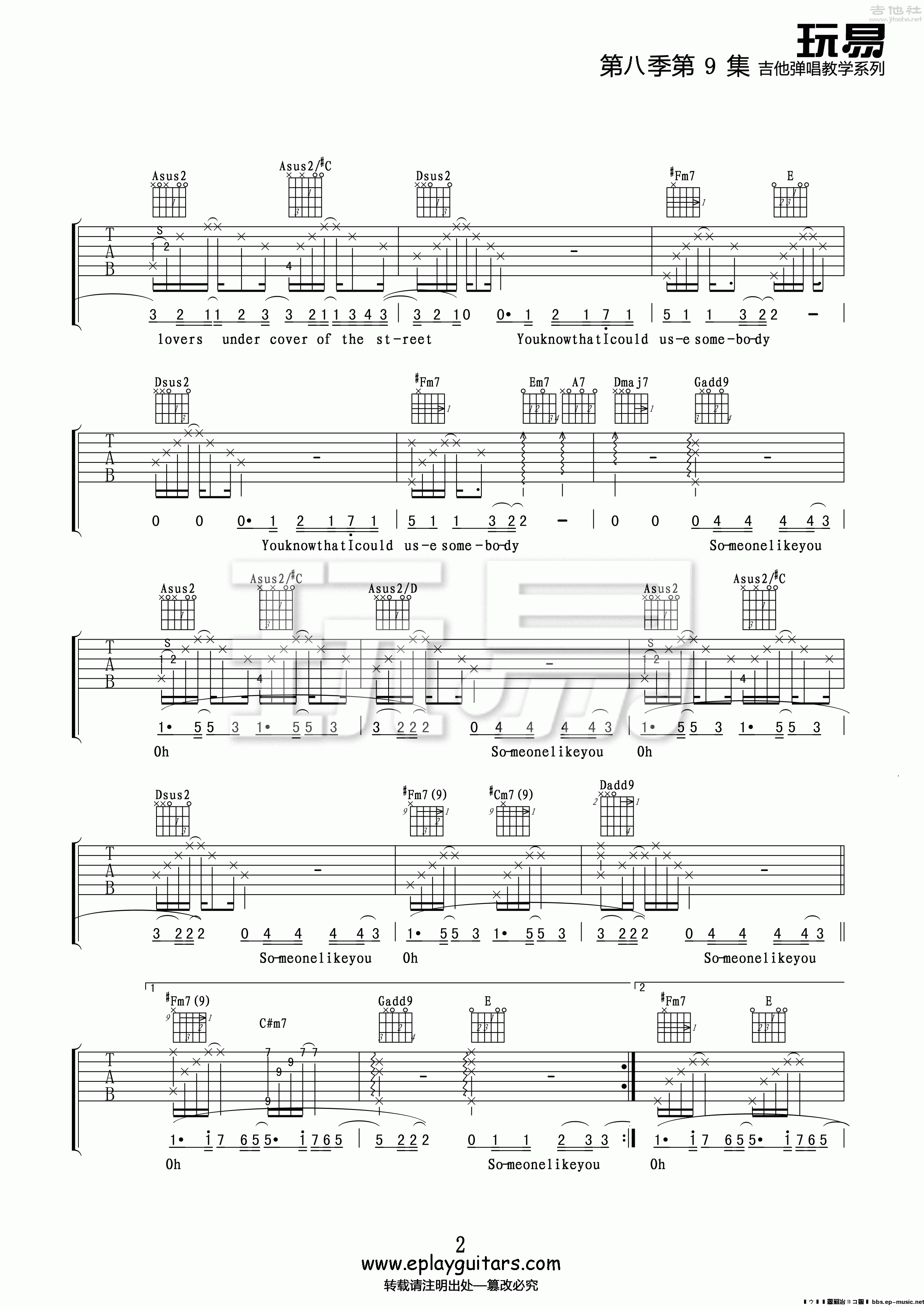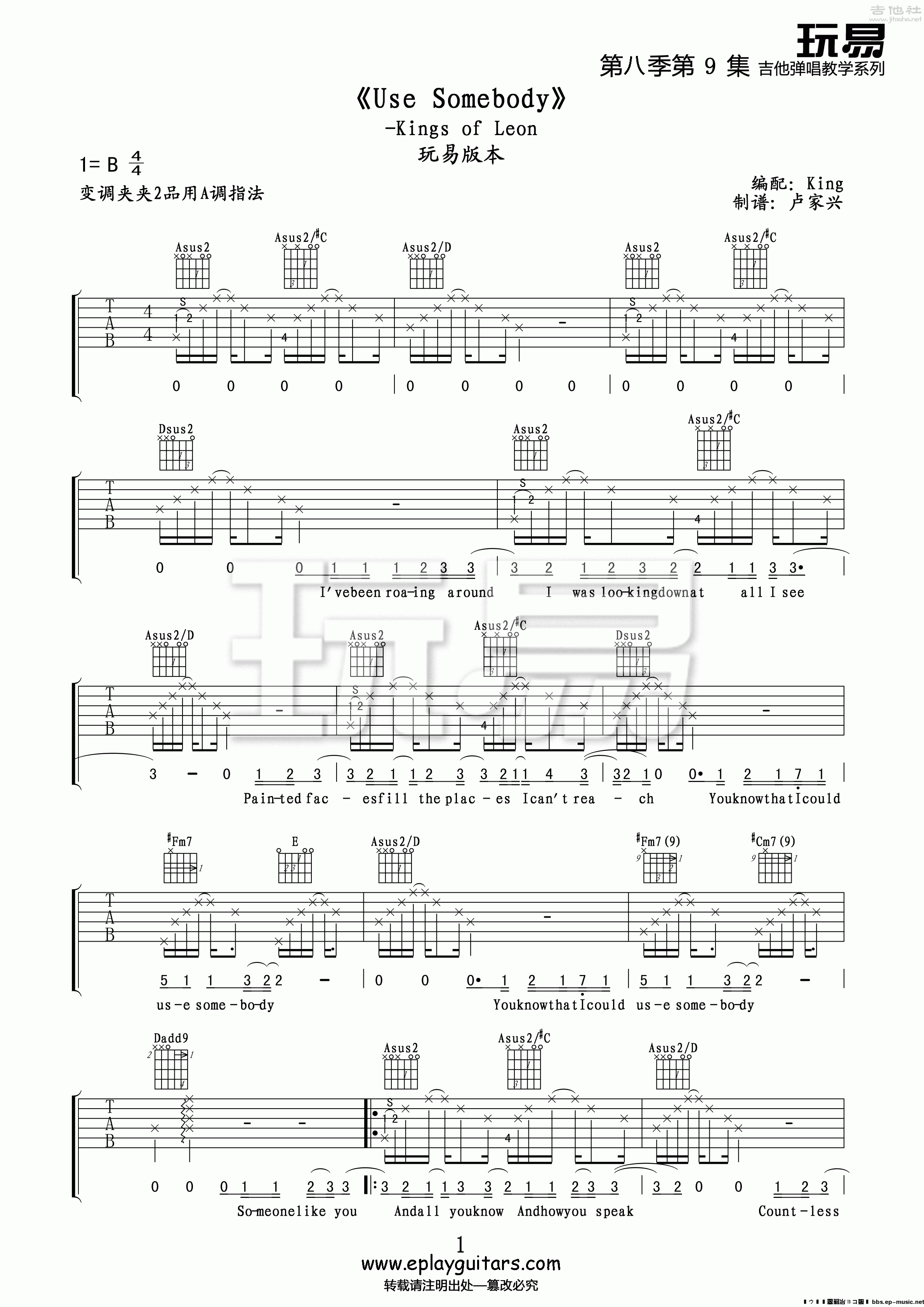 KingsOfLeon《UseSomebody》吉他谱,玩易编配出品,共有3张高清图谱。