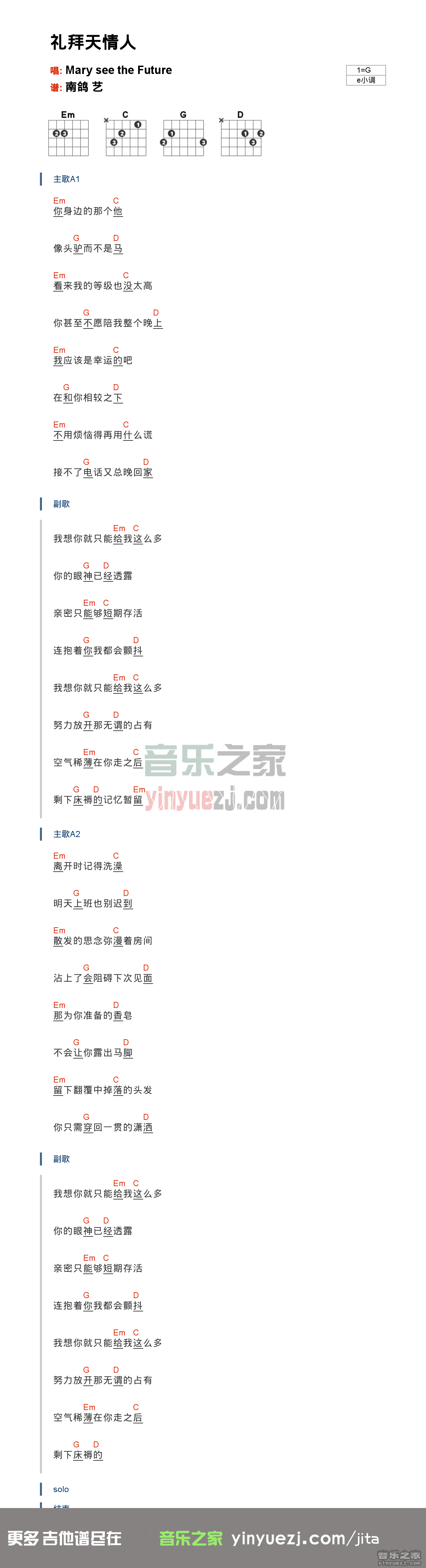 Mary See the Future《礼拜天情人》吉他谱_吉他弹唱谱_YYZJ编配