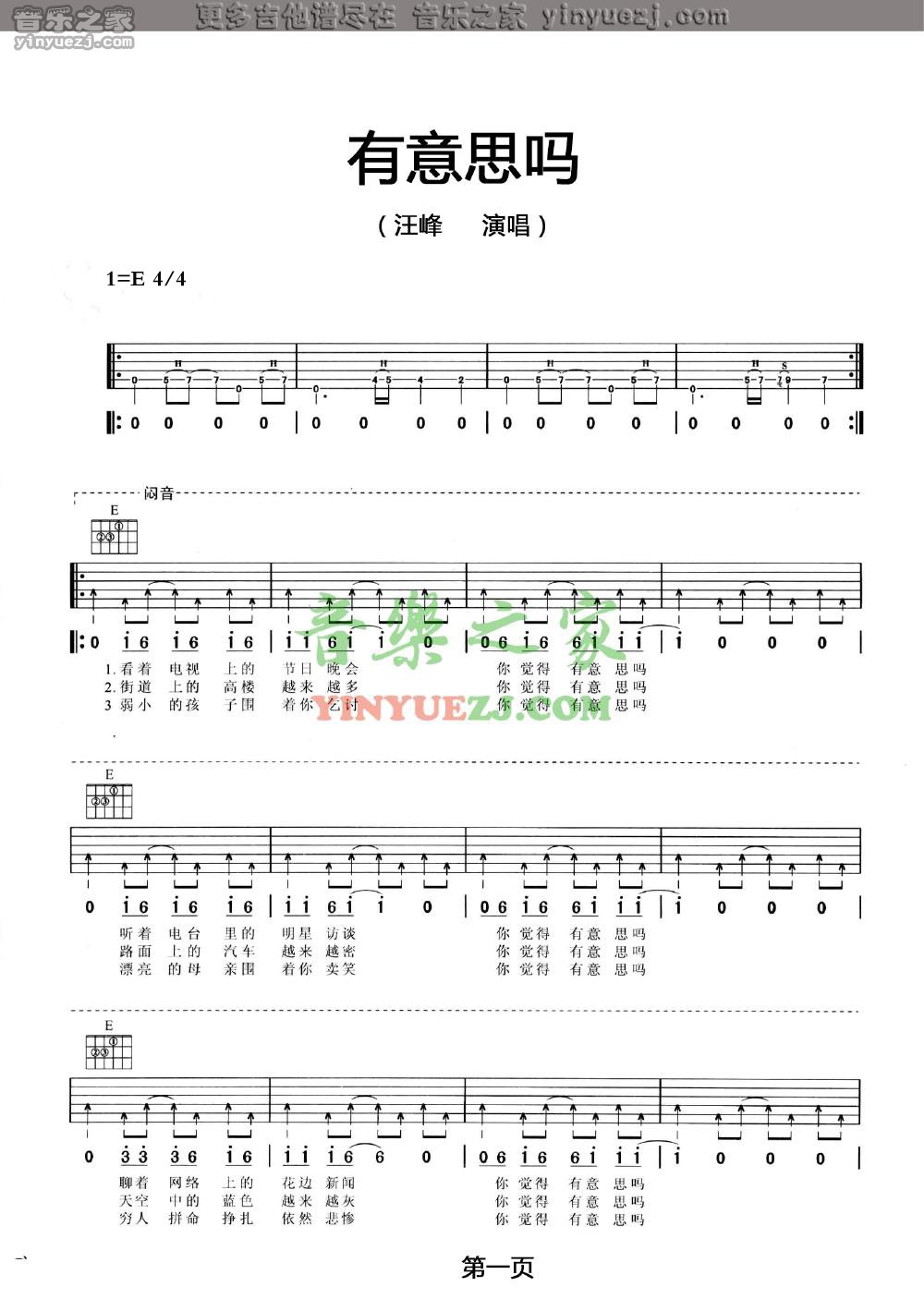 汪峰《有意思吗》吉他谱,YYZJ编配出品,共有2张高清图谱,免翻页排版设计。
