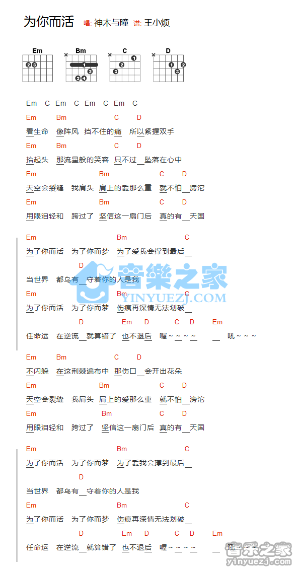 神木与瞳《为你而活》吉他谱_吉他弹唱谱_YYZJ编配