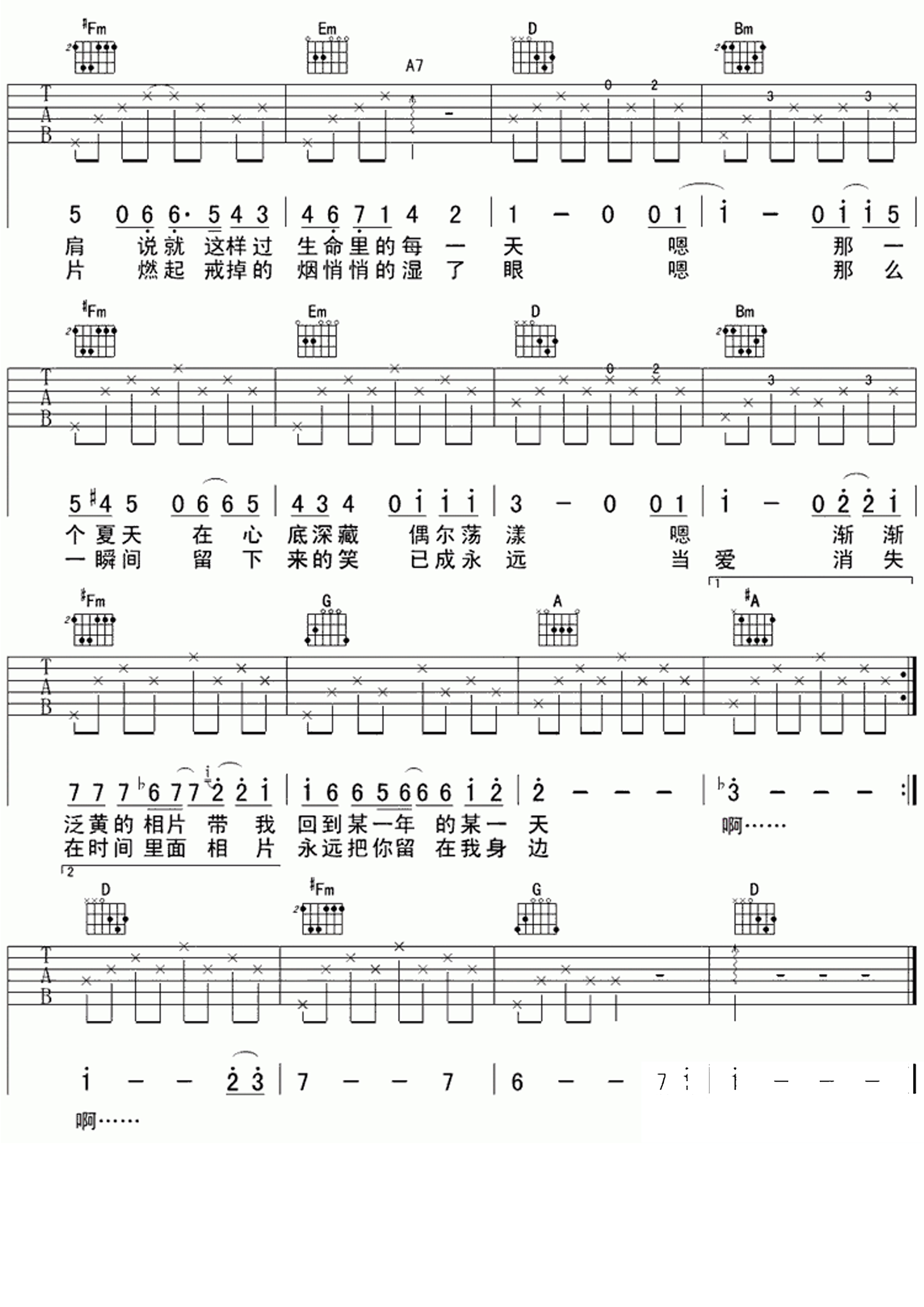 李健八月照相馆吉他谱,歌曲原调E转F使用变调夹夹2品。这是李健看韩国电影《八月照相馆》有感而创作的一首爱情主题歌曲,爱情经过岁月的沉淀,一如褪色泛黄的老照片,然而唯有你永远那么明媚靓丽。弹奏说明:李健《似水流年》专辑中的歌曲,曲式没有反复一般都很简单,但很多歌曲都有转调的情况,八月照相馆这首歌曲原曲转掉后,有一段弦乐演奏不适合吉他演奏,大家可以直接在#A和弦后接第二段的演唱,使用bE调指法,只把所有的和弦都向后移一位就可以。