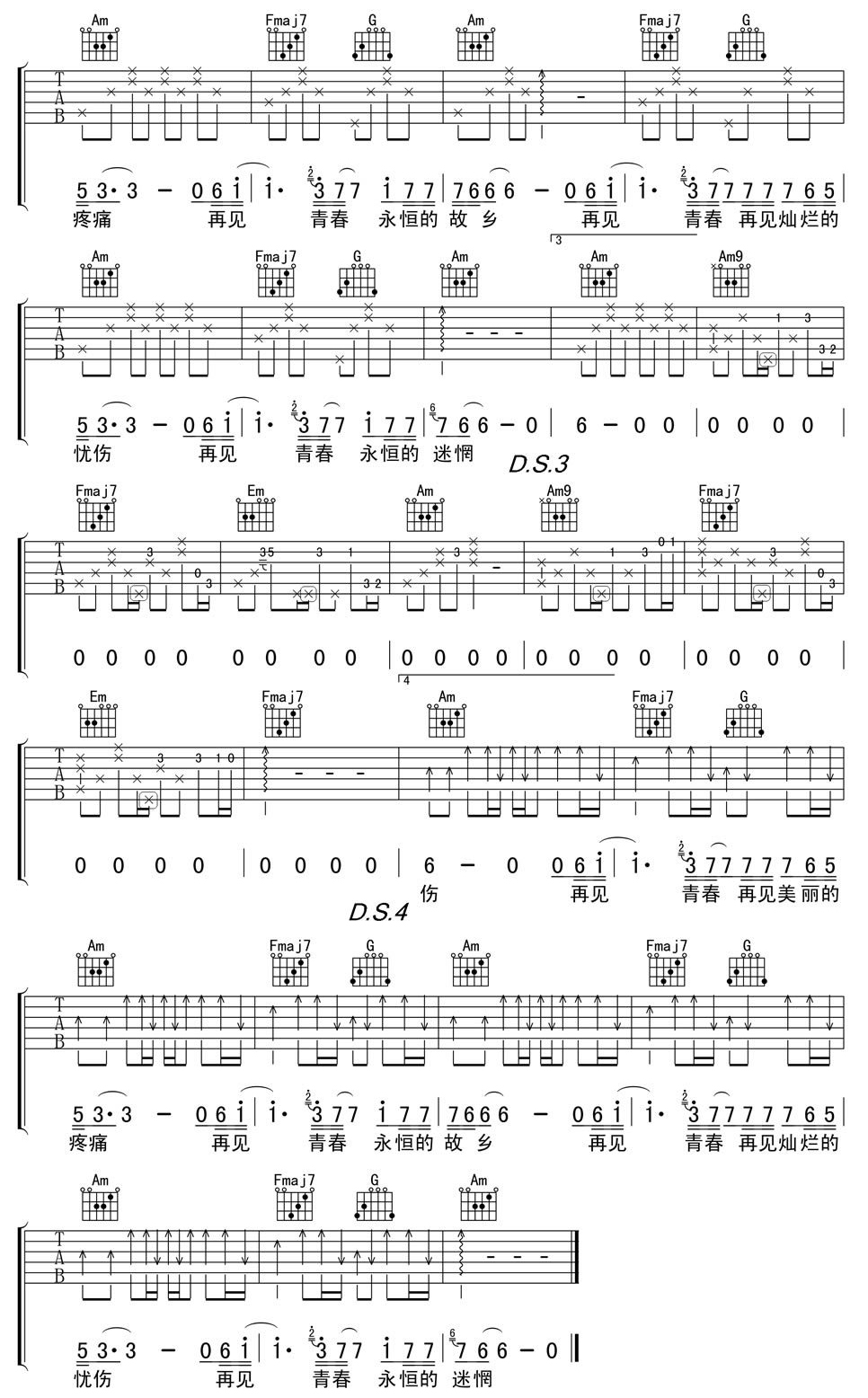 汪峰《再见青春》吉他谱_吉他弹唱谱_侍书琴社编配