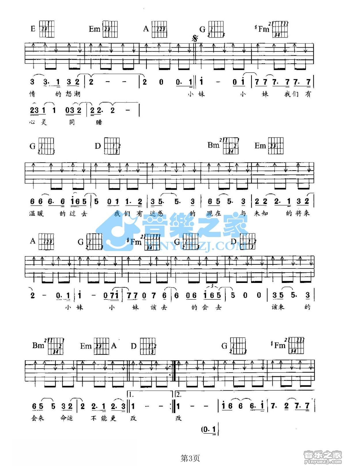 D调版罗大佑《小妹》吉他弹唱六线谱