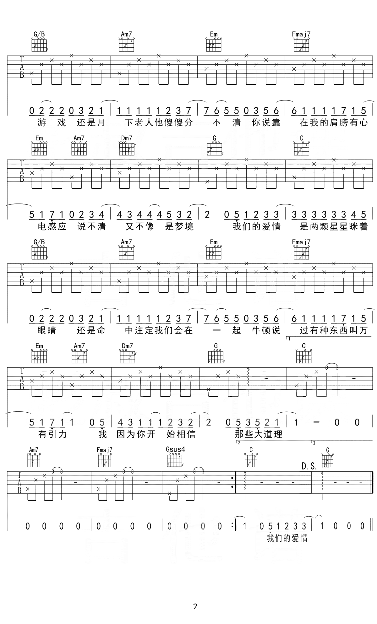 汪苏泷《万有引力》吉他谱,彪叔吉他编配出品,共有2张高清图谱,免翻页排版设计。