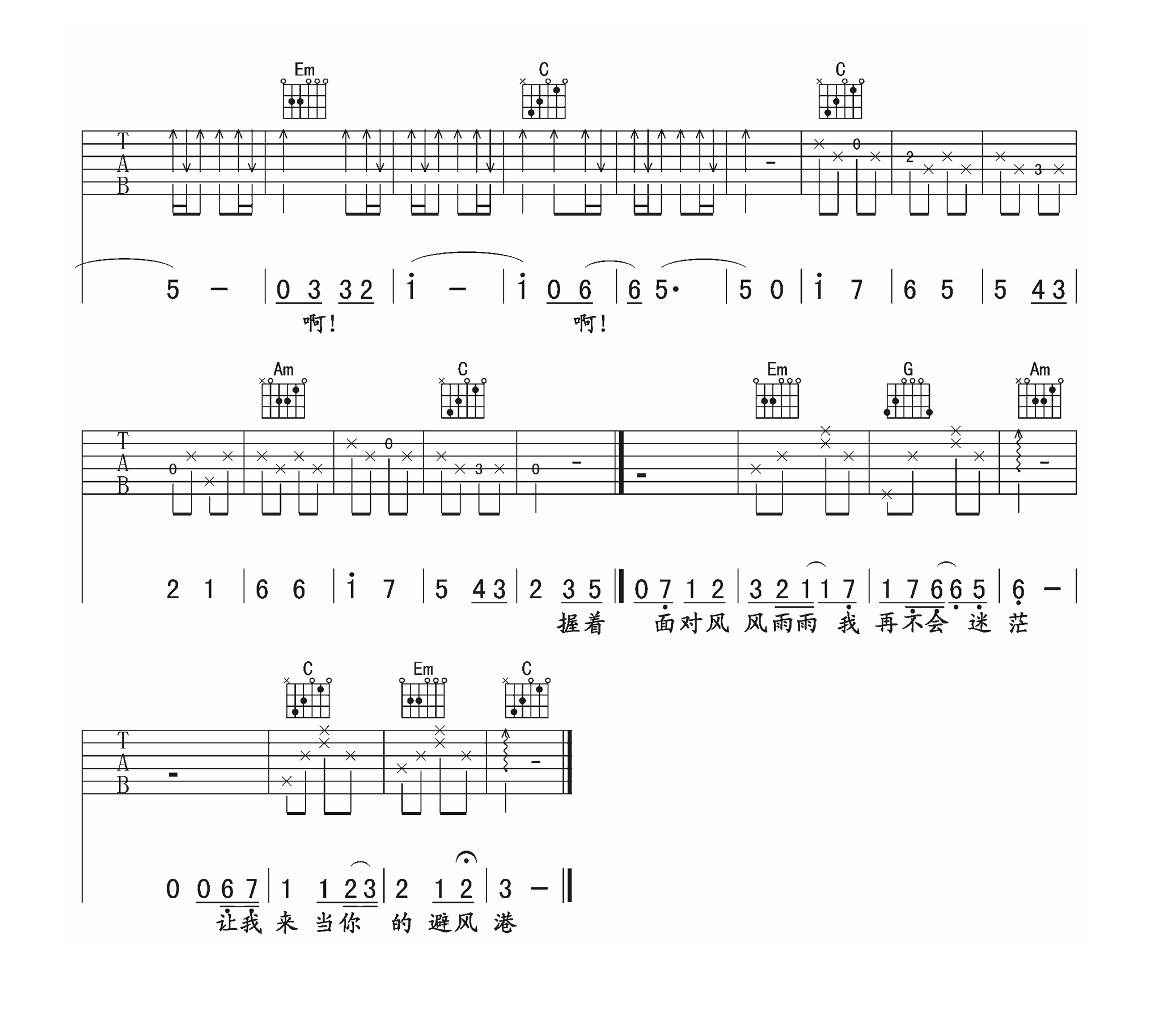 冯曦妤《避风港》吉他谱_吉他弹唱谱_午夜编配