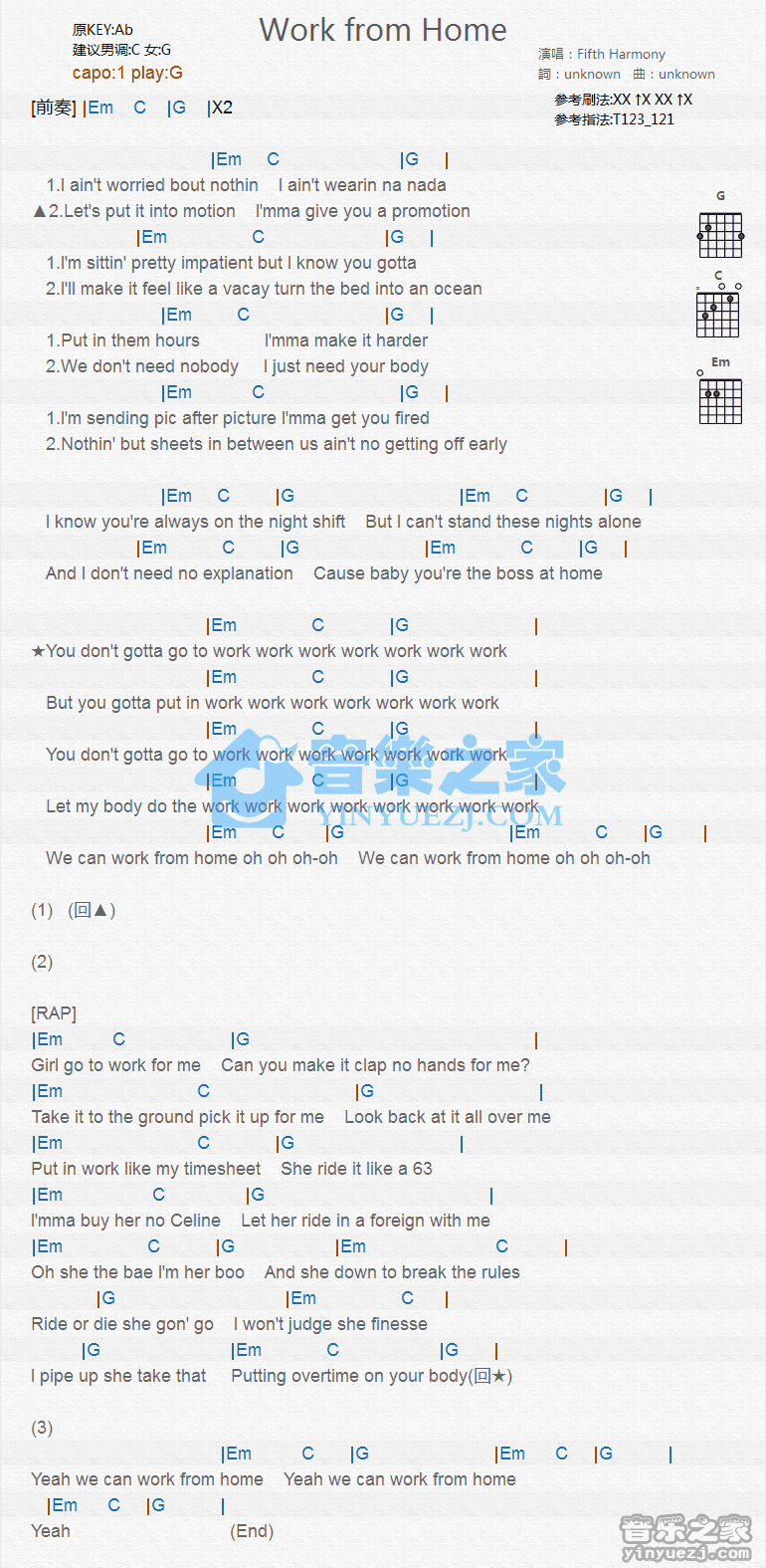 G调版 Fifth Harmony《Work From Home》吉他和弦弹唱谱