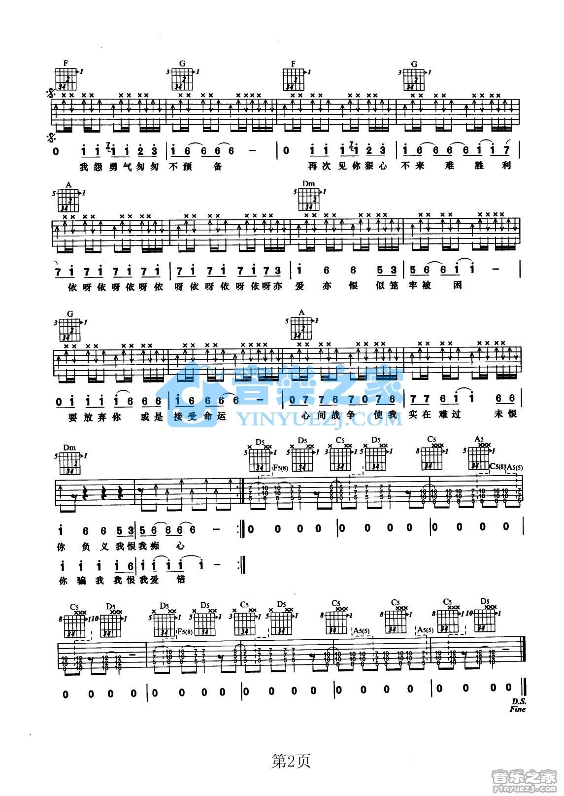 F调版《我恨我痴心》吉他弹唱六线谱