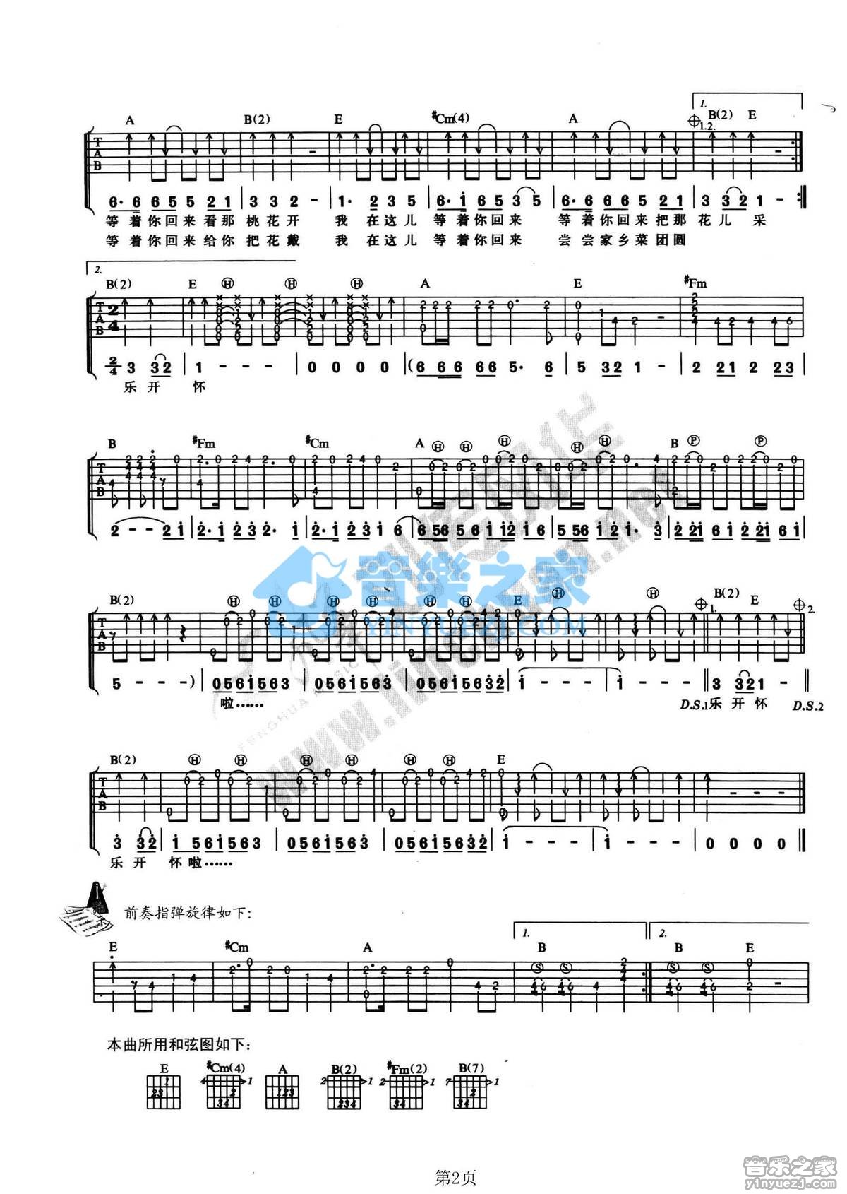 E调版《桃花朵朵开》吉他弹唱六线谱