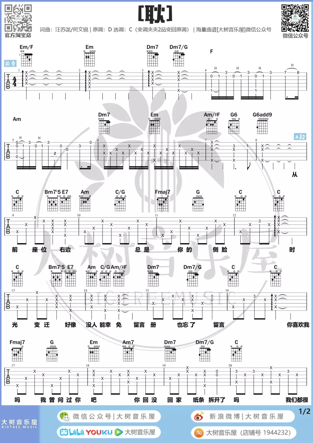 汪苏泷《耿》吉他谱_吉他弹唱谱_大树音乐屋编配