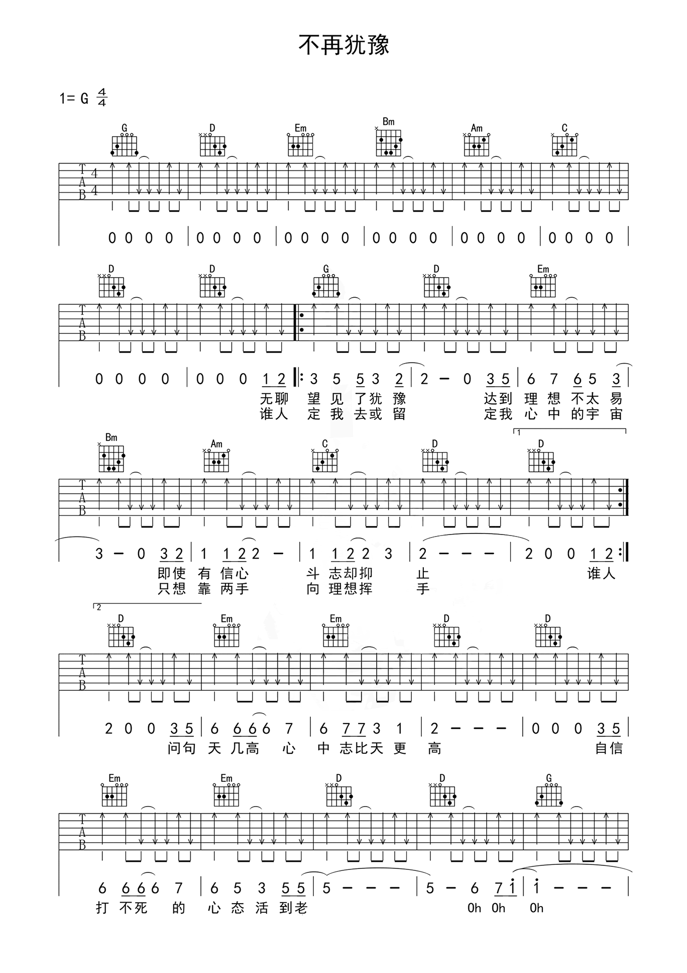 一首经典的粤语歌曲,不再犹豫吉他六线谱。全曲使用到六个和弦,来回循环就可以了。右手部分的扫弦方法,大家可以参照蓝莓吉他教学视频老师的讲解来练习。
