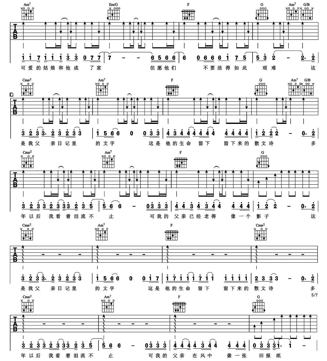李健版《父亲写的散文诗》,李健在原曲基础上加入了一个间奏和尾奏,深情的演唱不仅娓娓道来父亲对子女的爱,还把子女在察觉岁月流逝父亲迟暮的无奈诠释得丝丝入扣,让所有人泪湿眼眶,虽朴实无华却扣人心弦。《父亲写的散文诗》吉他弹唱演示和教程来自柠檬音乐编配《父亲写的散文诗》吉他谱,附弹唱视频教程。这个版本的原曲前奏是钢琴来完成的,这里移植到吉他上,保留了原曲的听感。整体难度中等,视频里分小节做了讲解,喜欢的朋友请不要错过。其他调式吉他教学参考:李健《父亲写的散文诗》吉他谱_吉他弹唱视频教学_G调中级版李健翻唱版《父亲写的散文诗》,无数诗歌是写给父亲的,而真正感人的却是父亲写的。这首歌道出了许多人的集体回忆,和对亲情说不出口又深藏在心的情感,听下去便忍不住击中泪点。