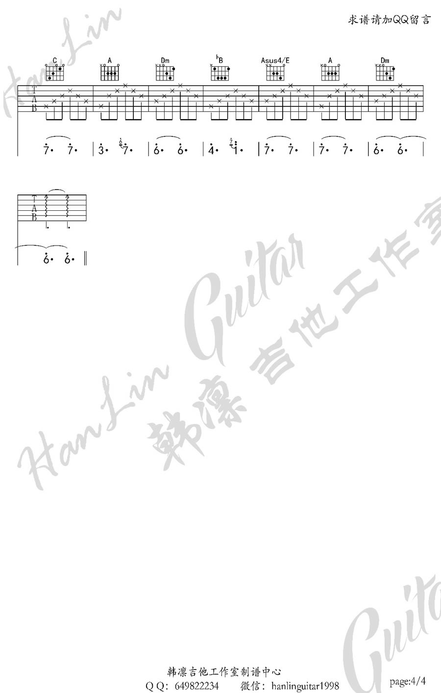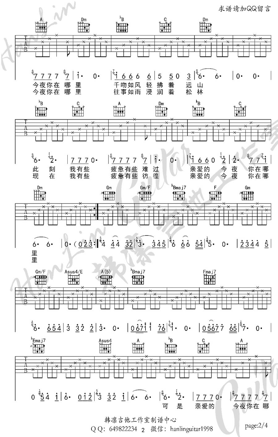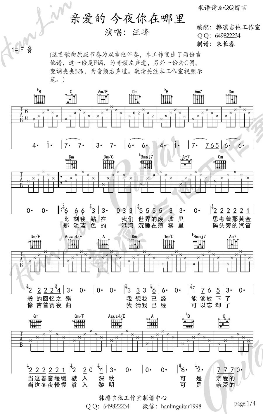 汪峰《亲爱的今夜你在哪里》吉他谱_吉他弹唱谱_韩凛吉他工作室--朱长春编配