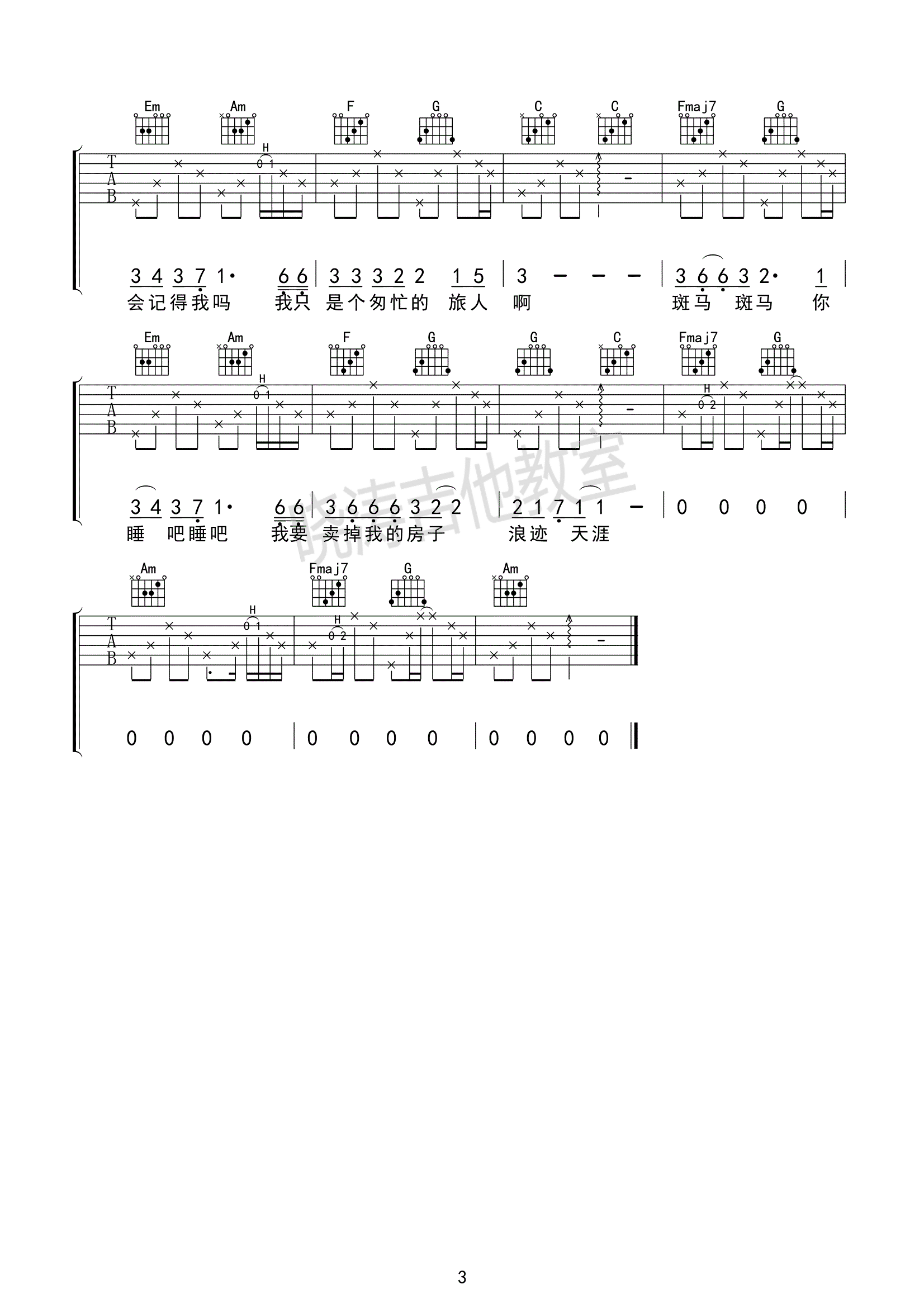 宋冬野《斑马斑马》吉他谱_吉他弹唱谱_晓涛吉他教室编配