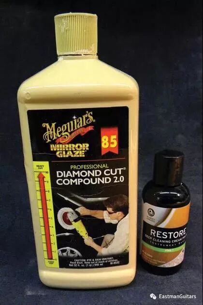 如果亮光漆面上有不少划痕,需要根据实际情况决定是否有必要抛光,取决于吉他的漆面的类型和损耗程度。如果是新琴,可以适当使用温和的抛光剂,比如Meguiar's M85 Mirror Glaze或者Planet WavesRestore。牢记!每次做抛光的时候,你都是在打磨掉一部分漆面,所以抛光频率不宜过高,尽可能地谨慎。