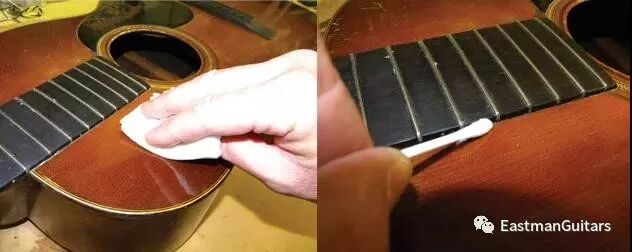 我推荐使用湿纸巾或蘸湿的微纤维琴布清洁吉他,将少量清洁剂喷到琴布上,然后轻轻擦除污垢。一些死角或缝隙可以用棉签清洁。