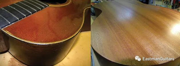 用在吉他上的漆面有很多种,专业乐器一般都是用传统的硝化纤维漆(就是我们所说的硝基漆)。硝化纤维漆是一种轻薄、牢固的漆面,可以让木材更充分的震动。