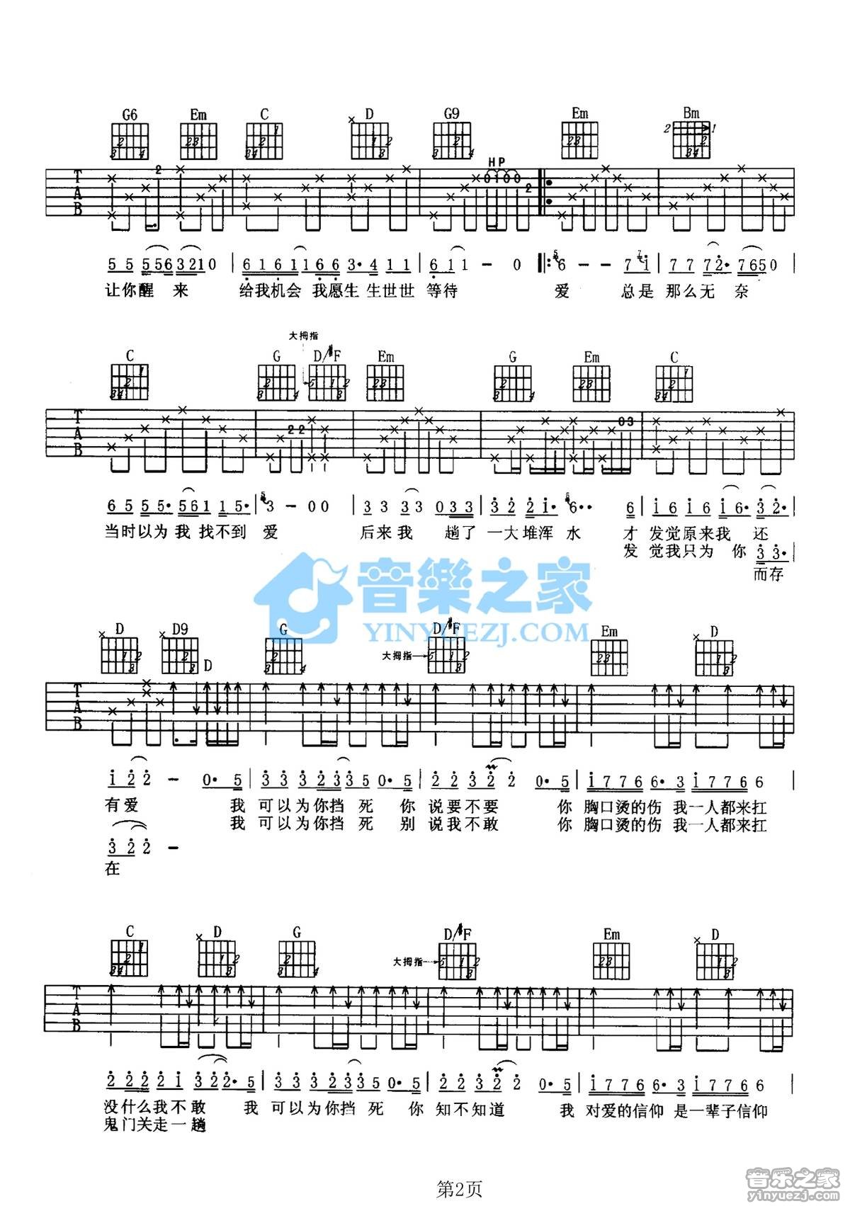 G调版《我可以为你挡死》吉他弹唱六线谱