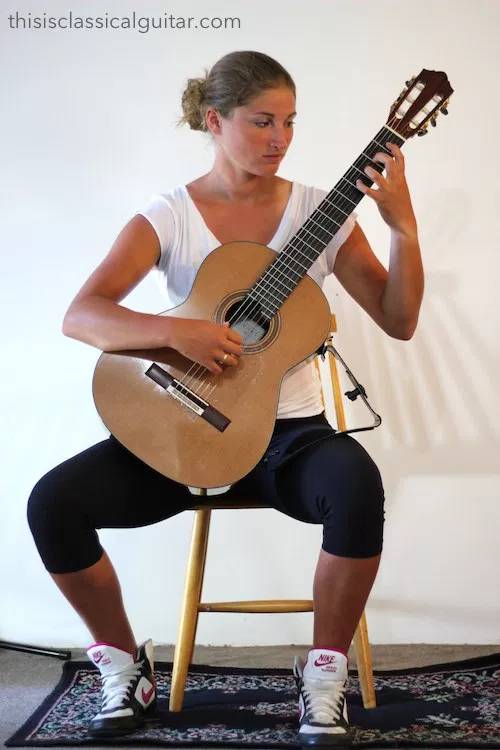 从古典吉他女神杨雪菲的这张照片上,你可以看出,虽然也是三个点固定住琴身,但是整体琴体还是比较靠前的,在琴身背面,有一些空间,正因为有这些空间在,所以,女孩子弹奏的时候,完全不会感觉到任何胸部的不适。