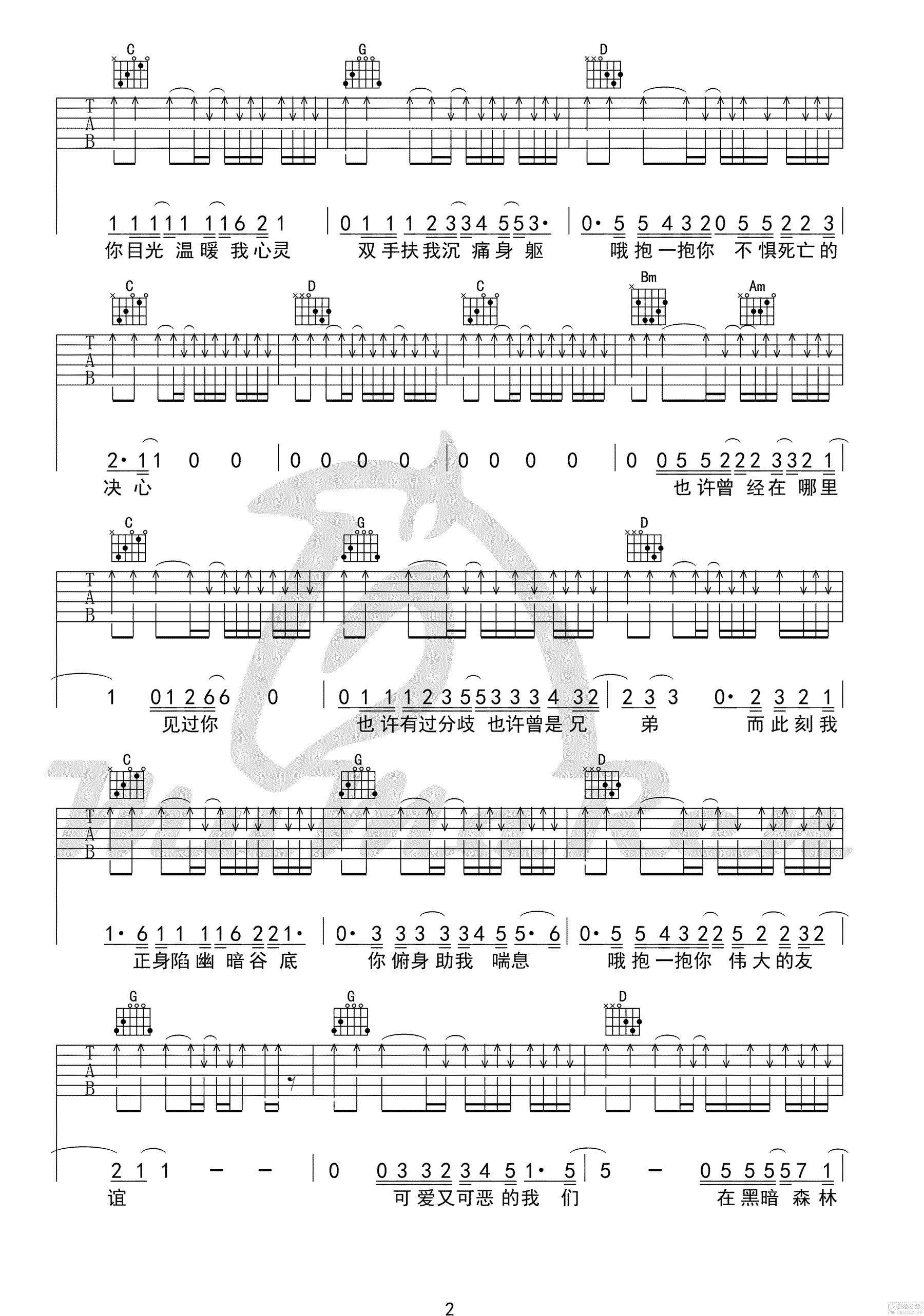 此曲谱弹奏简易,没有大横按,适合吉他初学者。伟大的友谊六线谱,原调bB,选调G,CAPO夹三品。完整高清版共四张图片谱,牧马人乐器编配出品
